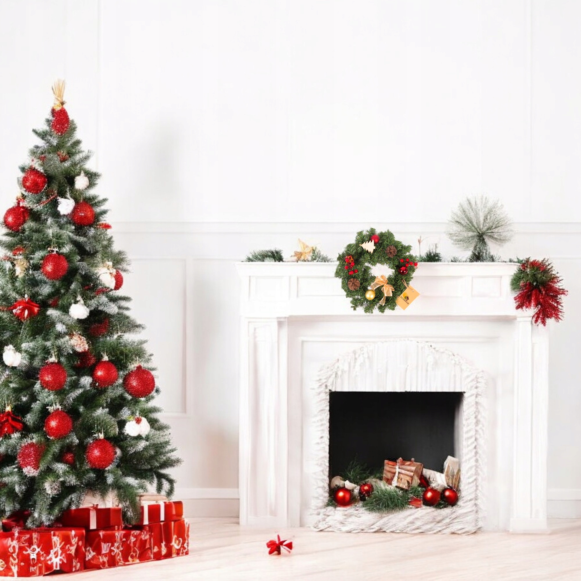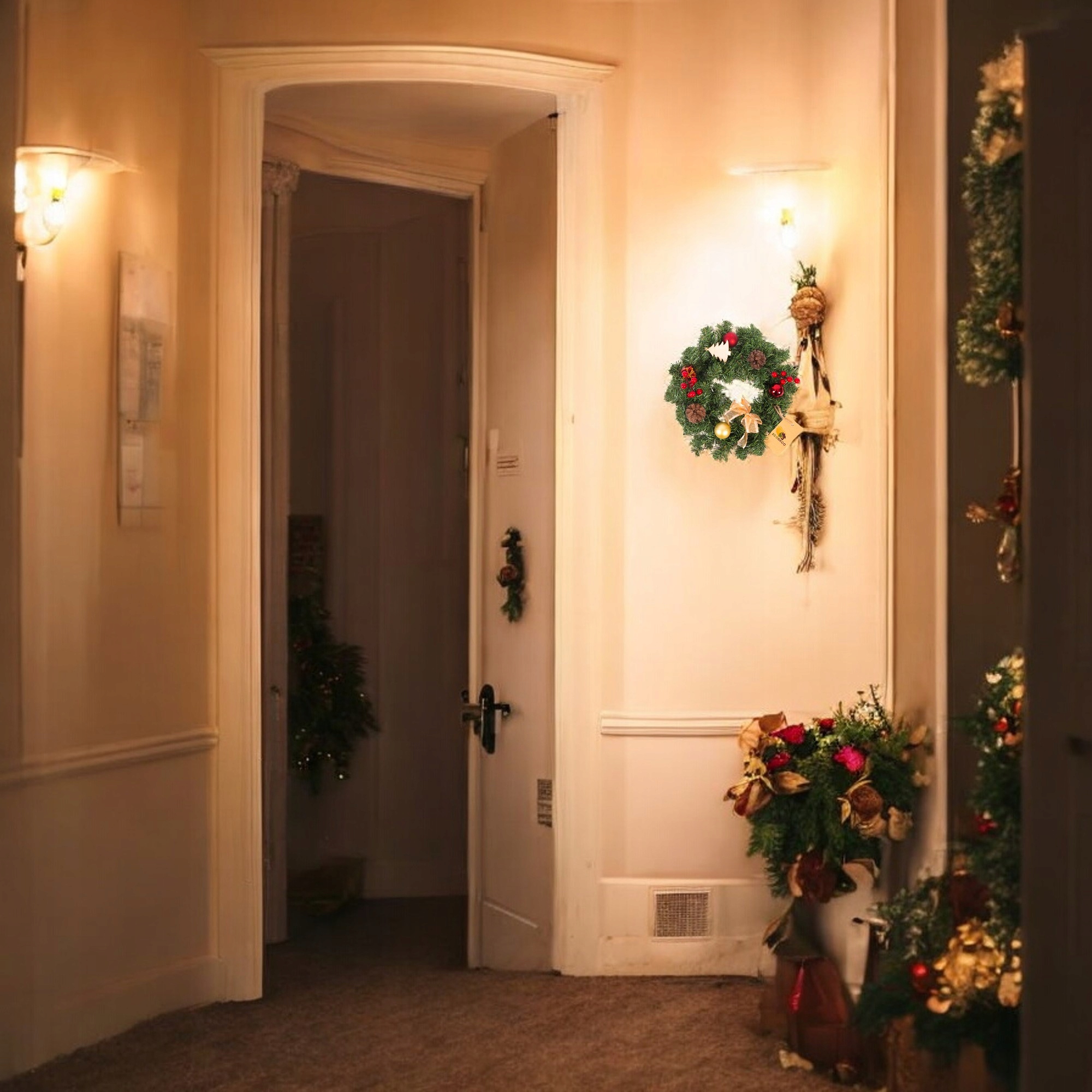 ✅ Стильний дизайн і велика кількість деталей: виготовлений з міцних, реалістичних гілочок ПВХ, які не деформуються і залишаються свіжими для багатьох сезони. На вінку ви знайдете ретельно підібрані прикраси, які створюють гармонійне ціле: