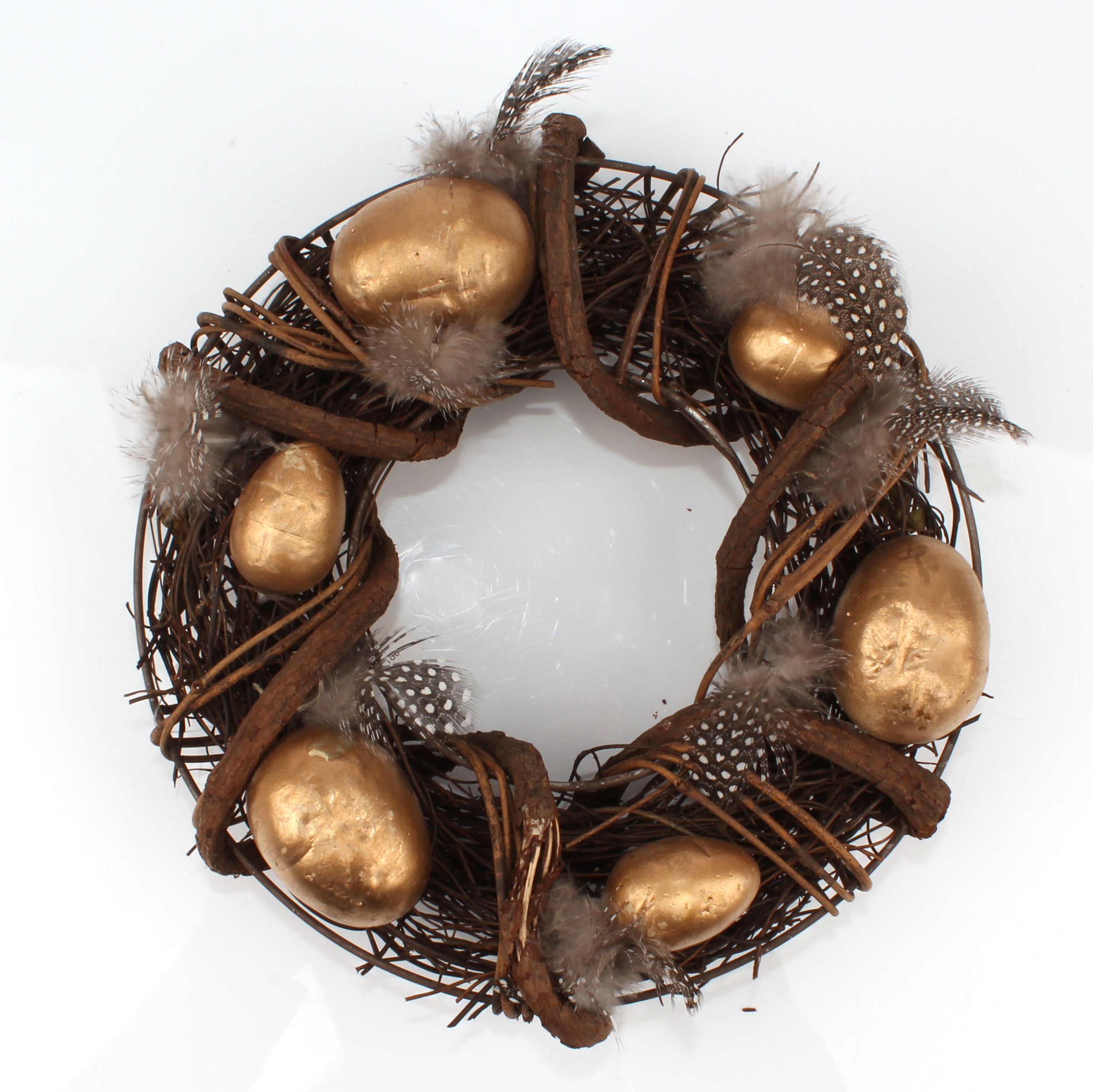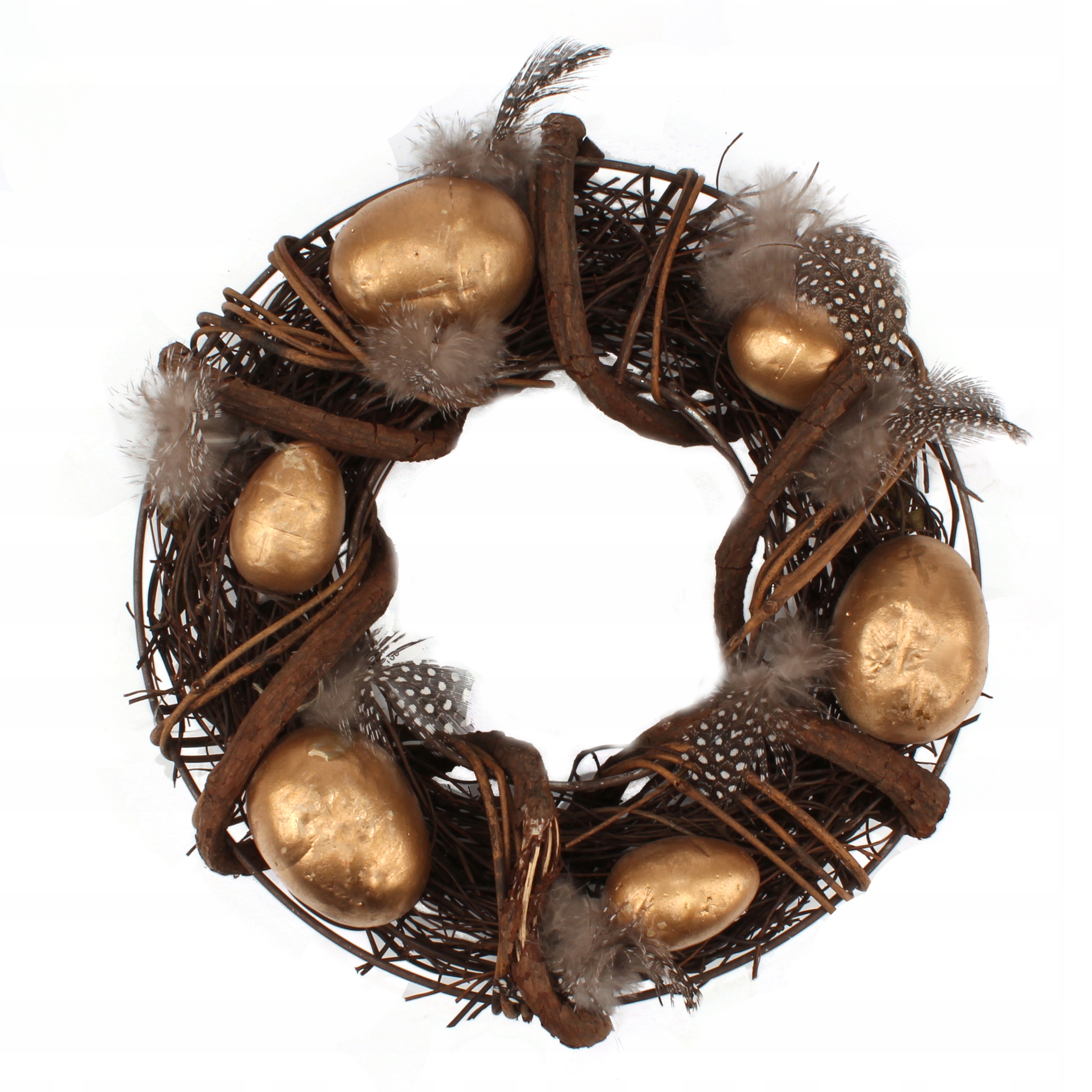 WIANEK WIELKANOCNY ZŁOTE JAJKA PIÓRKA DEKORACJA NA DRZWI STROIK 22 CM