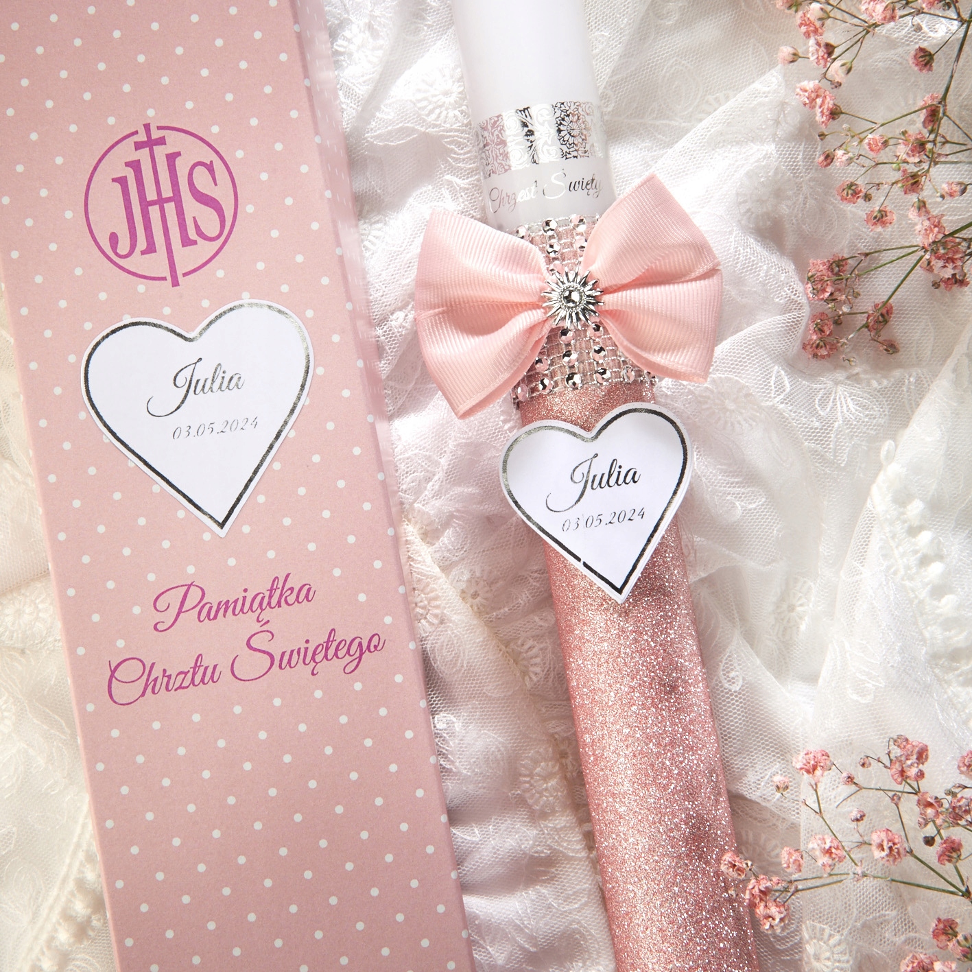 Свічка має сердечко з ім'ям та датою, написаними на сердечку та написом "Святе Хрещення", яке виконано методом гарячого тиснення (гарно мерехтливий сріблястий принт). в повідомленні продавцю надішліть:< /h1>