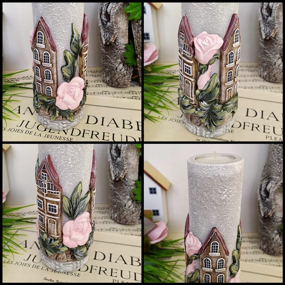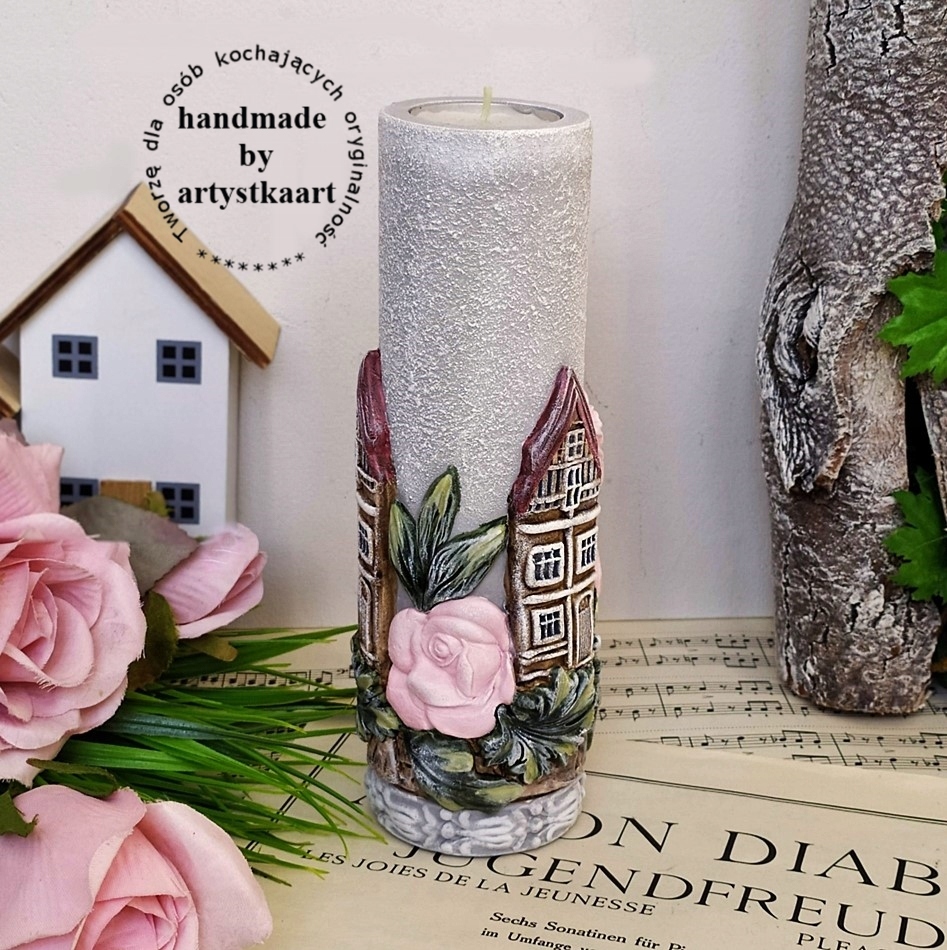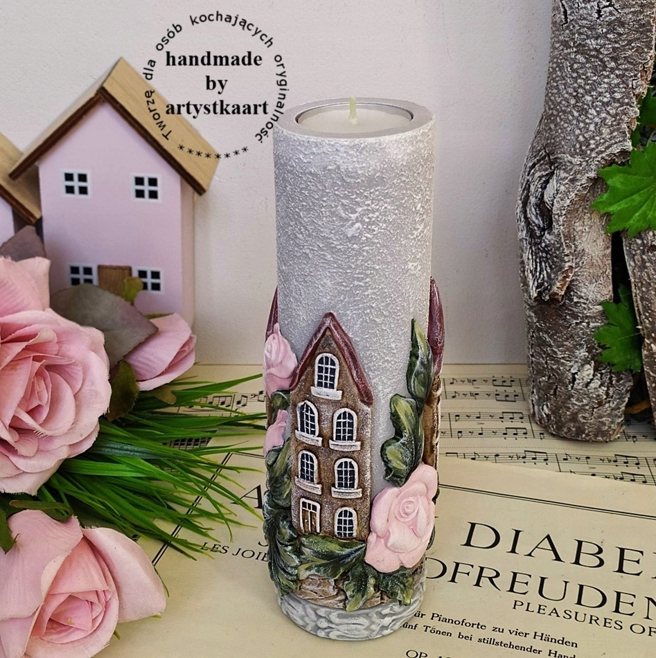 ŚWIECZNIK drewniany na podgrzewacze rękodzieło KAMIENICZKI wys. 20 cm
