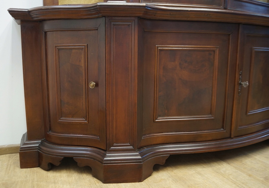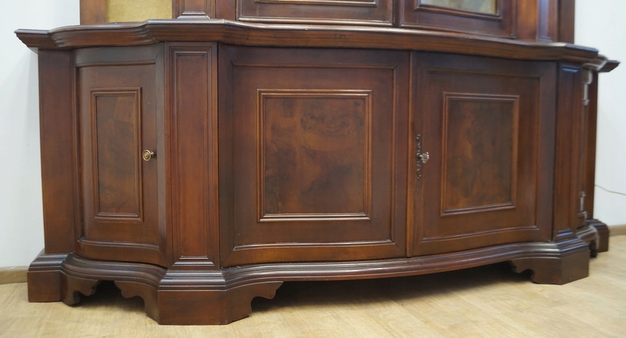 Має двоє скляних дверей на зверху і з боків відкриті частини, полиці обшиті стильною тканиною, внутрішня частина верхніх дверей підсвічується. У нижній частині є чотири гарно оздоблені двері. Предмет меблів незвичайних форм, стильних і вражаючих прикрас. Красиві декоративні елементи роблять цей предмет меблів унікальним і особливим.