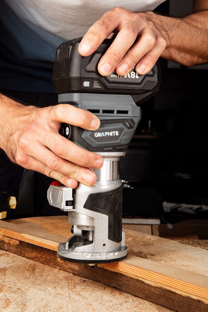 Акумуляторний безщітковий фрезерний верстат Energy+ 18 В 58GE140 від GRAPHITE характеризується швидкістю обертання від 12 000 до 30 000 обертів на хвилину та міцним безщітковим двигуном. Має функцію плавного старту і можливість швидкого зняття блокування. Кулачки дозволяють регулювати глибину фрезерування і зручне зняття і встановлення основи. Розмір цанги 6,35 мм. Акумуляторна фрезерна машина оснащена світлодіодним робочим освітленням, що забезпечує хорошу видимість робочої зони. Час простою залежить від використовуваного акумулятора - 2 Ач 25 хвилин, 4 Ач 50 хвилин або 6 Ач 75 хвилин. Пристрій пропонується в стандартній комплектації: втулка 6 мм, втулка 6,35 мм, прямий різець 6,35 мм і паралельна направляюча. Рекомендується для згладжування та обробки кромок при обробці деревини. Регулювання глибини забезпечує точне фрезерування, а алюмінієва ніжка гарантує більшу стабільність і точність роботи. Інструмент торгової марки GRAPHITE рекомендований професіоналам і любителям DIY.