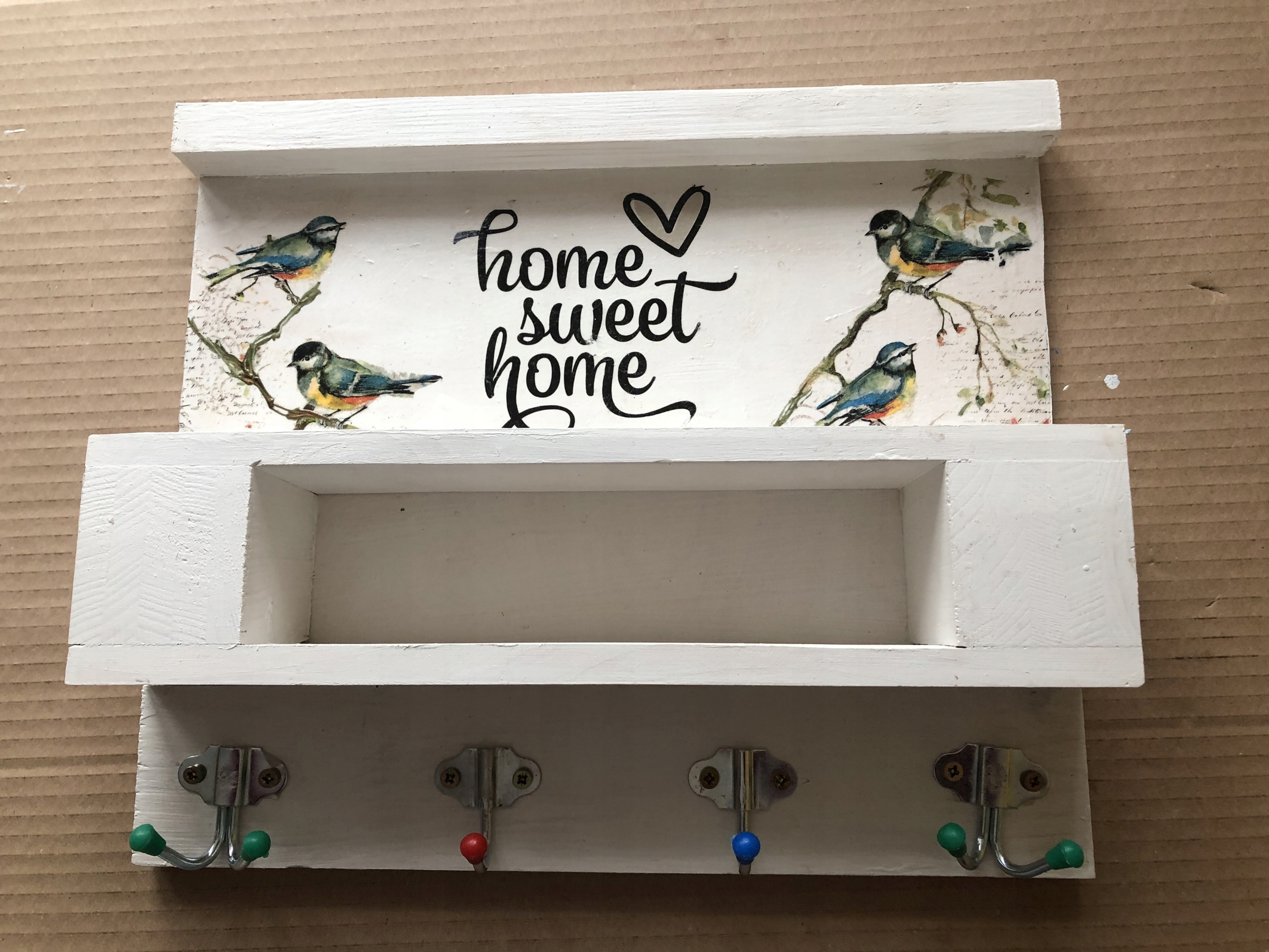 Wieszak na klucze z póleczka - home sweet home - ptaszki - biały