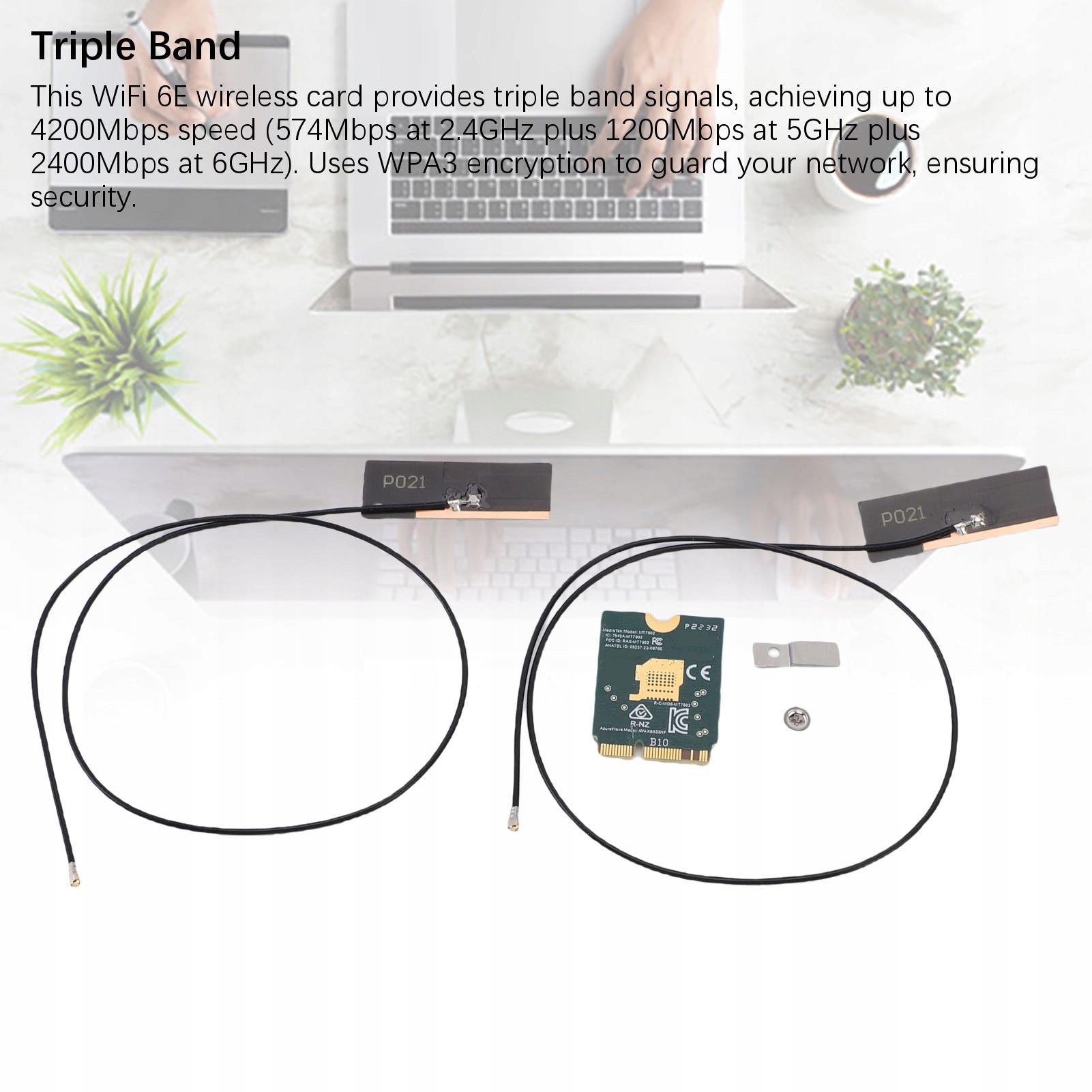 1. Потрійний діапазон: ця бездротова карта Wi-Fi забезпечує тридіапазонний сигнал, досягаючи швидкості до 4200 Мбіт/с (574 Мбіт/с на 2,4 ГГц плюс 1200 Мбіт/с на 5 ГГц плюс 2400 Мбіт/с на 6 ГГц). Використовує шифрування WPA3 для захисту вашої мережі та вашої безпеки.