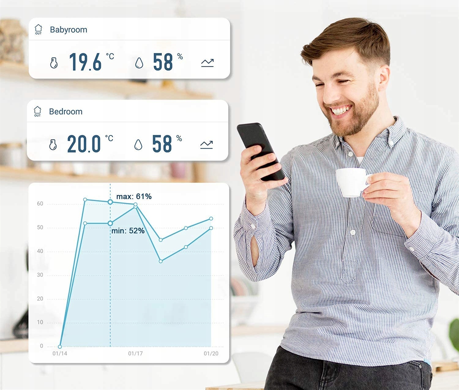 Вбудовані датчики високого класу вимірюють температуру та вологість з точністю до ±0,5°C і ±2% відносної вологості. Швидке реагування дає змогу залишатися в курсі відповідних показань.