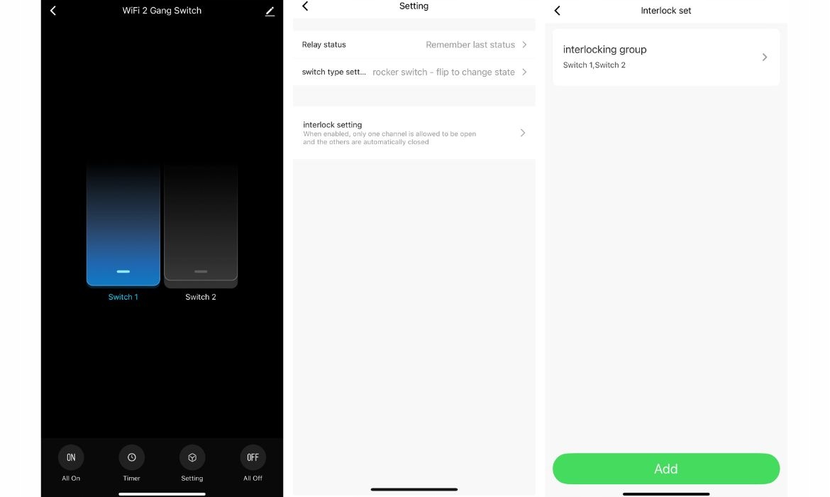 Функція «Налаштування блокування» доступна в налаштуваннях реле, тобто взаємне блокування каналів. При активації ввімкнення одного каналу автоматично вимикає інший. Це особливо корисно в ситуаціях, коли два контури не повинні бути активними одночасно - наприклад, під час керування двома напрямками руху, вибору режиму роботи або перемикання джерел світла. Функцію можна легко ввімкнути або вимкнути безпосередньо в програмі Tuya або Smart Life.