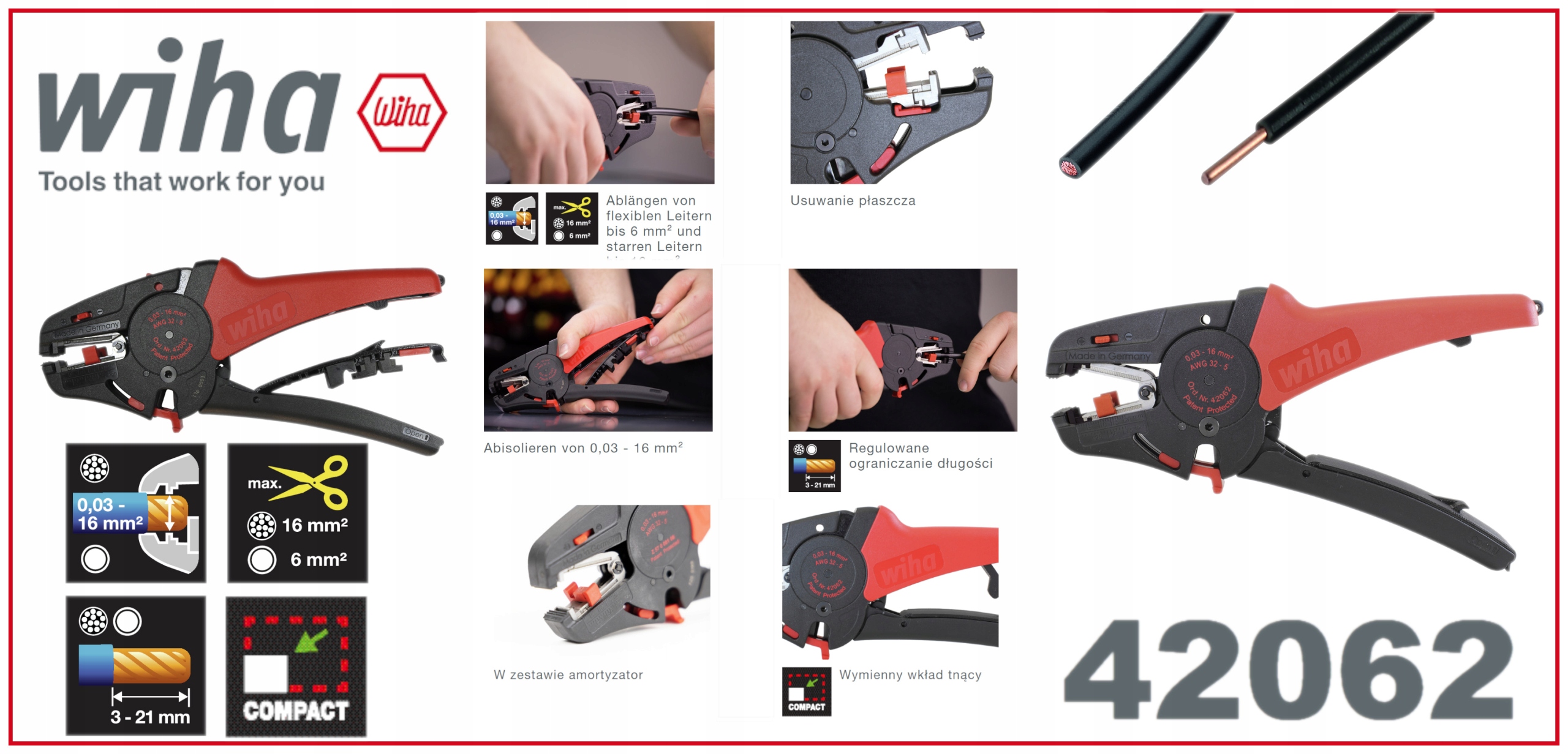 "Простий спосіб зняття зачистки" забезпечує автоматичні кліщі для зачистки дроту від Wiha. Функція різання дозволяє відрізати кабелі на потрібну довжину. Крім того, вбудований захисний кожух леза запобігає травмам рук, а завдяки функції автоматичного закривання можна уникнути випадкового пошкодження конструкції кабельного джгута. За допомогою однієї пари кліщів можна знімати зачистку з кабелів з поперечним перерізом 0,03-16 мм². Крім того, регульована довжина обмежувача забезпечує точну роботу. Крім того, щипці для зняття ізоляції характеризуються дуже тихою роботою. Щоб зменшити віддачу та захистити ваші зап’ястки під час зачистки кабелів із великим поперечним перерізом понад 6 мм², ви можете використовувати амортизатор, який входить у комплект плоскогубців. Крім того, запасні ножі та змінні елементи, заховані в рукоятці, можна використовувати в будь-який час. Після закріплення ручки стриппери надійно зафіксовані на місці та не займають багато місця, що робить їх оптимальними для транспортування.