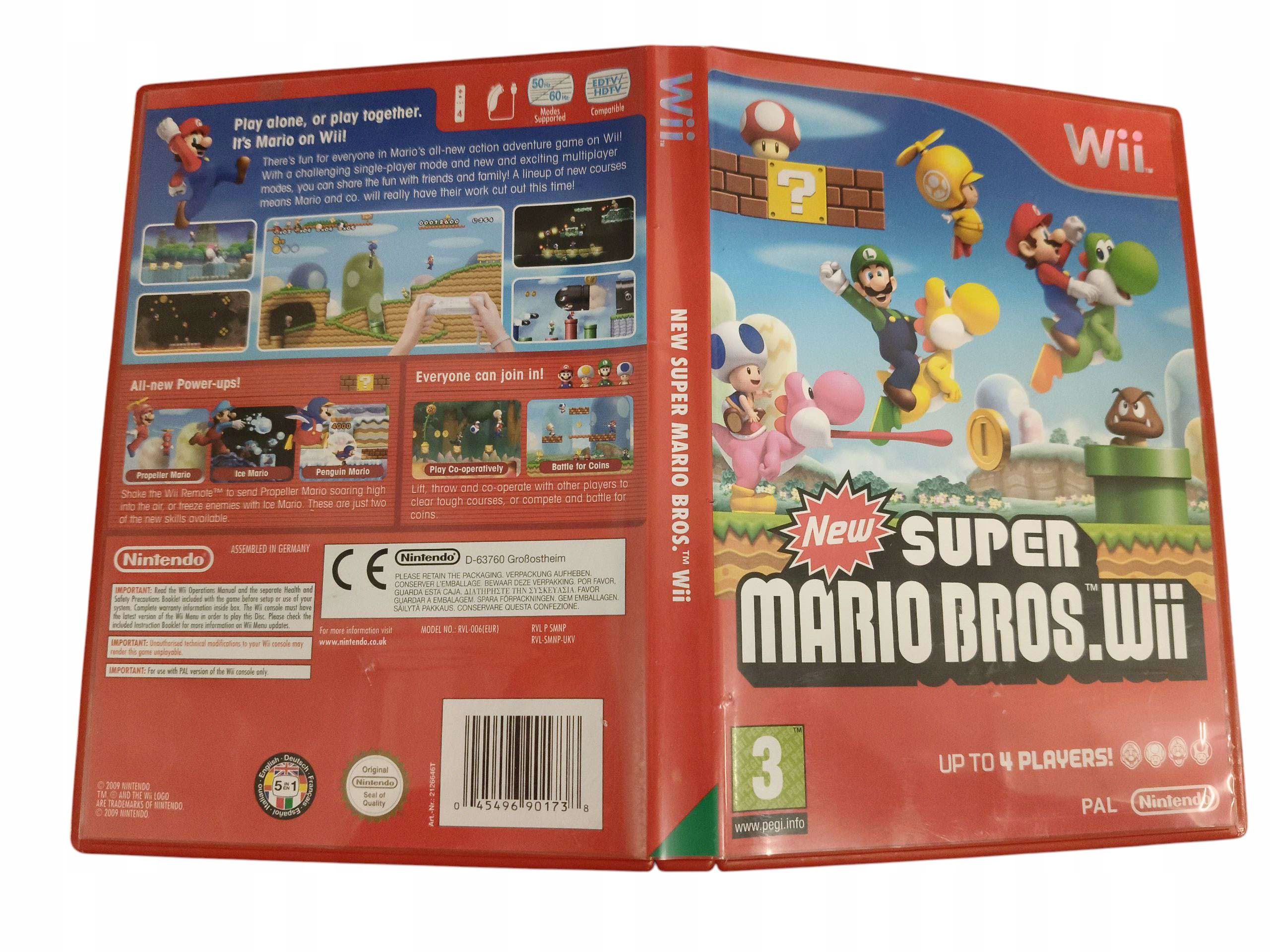 Новий Super Mario Bros. Wii — це платформер із розвиненим багатокористувацьким режимом. Постановка заснована на грі New Super Mario Bros., випущеній для консолі Nintendo DS в середині 2006 року. Твір розроблено та опубліковано Nintendo. Нова Super Mario Bros. Wii — це незвичайне поєднання режимів співпраці та змагання між гравцями. Люди, що володіють контролерами, не тільки борються один з одним, кидаючись з насипів або викрадаючи зібрані монети, а й співпрацюють, що важливо на багатьох частинах рівнів. В іншому випадку гравці не зможуть подолати перешкоди, які підготували творці. У грі ми граємо за Маріо, Луїджі та двох жаб. На пізніших етапах будь-хто також може їздити на Йоші в кількох колірних варіаціях. У New Super Mario Bros. було додано кілька нових елементів щодо спорядження персонажа. Час від часу є можливість стрибнути в так званий костюм пропелера, завдяки якому ми уникнемо падіння в прірву. Також варто відзначити наявність костюма пінгвіна, який захистить нас від замерзання після падіння в крижану воду взимку. Наприкінці кожного рівня всі гравці отримують доступ до статистики, що дозволяє їм оцінити, хто з них зробив найкраще. Гра, звичайно ж, підтримує Wiimote. Струшування контролера дозволяє нам, серед іншого, досягти вищих виступів і звільнитися від рук іншого гравця.