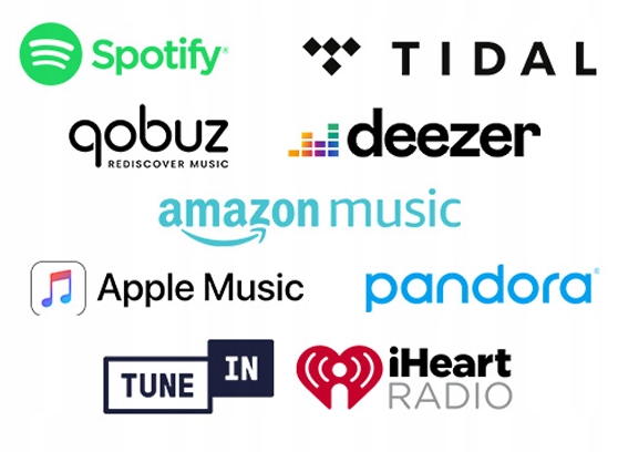 - Музичні служби: Amazon Music, Apple Music, Deezer, Pandora, Qobuz, Spotify, TIDAL, TuneIN, iHeartRadio