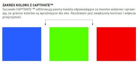 На графіку поруч показано значення пропускання для синього, червоного та зеленого кольорів. Затемнені зони показують місця, де перекриваються хвилі, відповідальні за розмитість зору. Технологія CAPTIVATE усуває цей ефект і забезпечує чітке бачення кольорів і чудову контрастність.