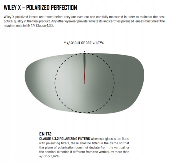 Поляризаційні лінзи Wiley X виготовлені з селеніту (полікарбонату), а поляризаційний фільтр розміщено всередині лінз, забезпечуючи захист від псування та пошкодження під час носіння та чищення. Всі поляризаційні моделі WileyX виготовляються з використанням тільки найкращої технології поляризаційних фільтрів. Фільтр розміщено в об'єктиві з допуском лише +/- 3%, що робить Wiley X єдиною компанією, яка може похвалитися сертифікацією всієї лінійки продуктів.