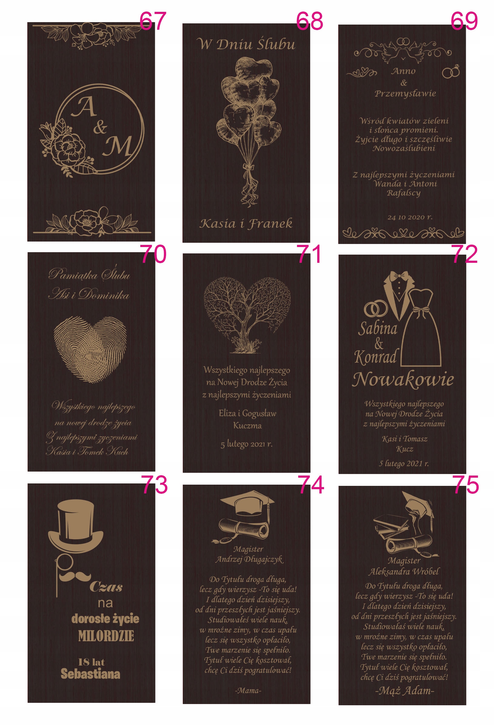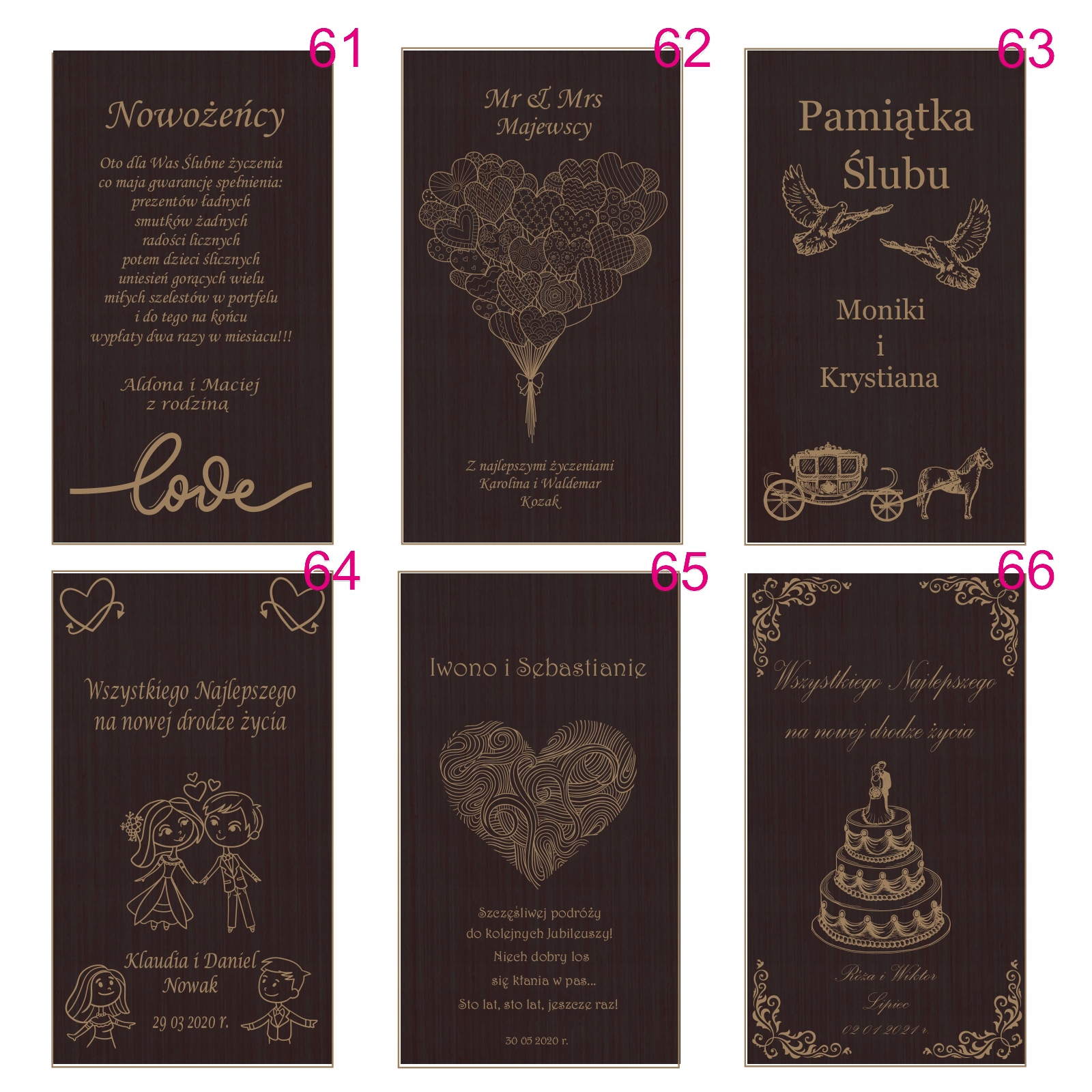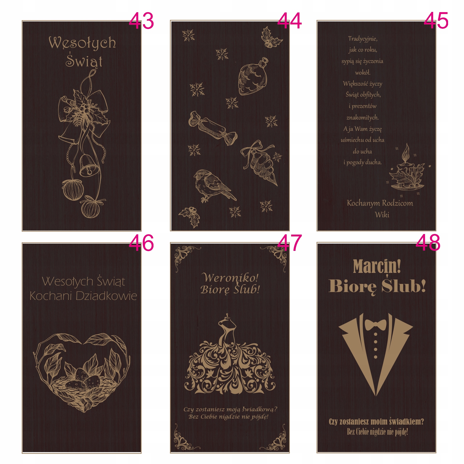 Текст вигравірувано на зовнішній стороні коробки. Клієнт може вибрати візерунок гравіювання (один із наведених нижче) та його персоналізований вміст (відповідно до шаблону), який слід надіслати продавцю в повідомленні.