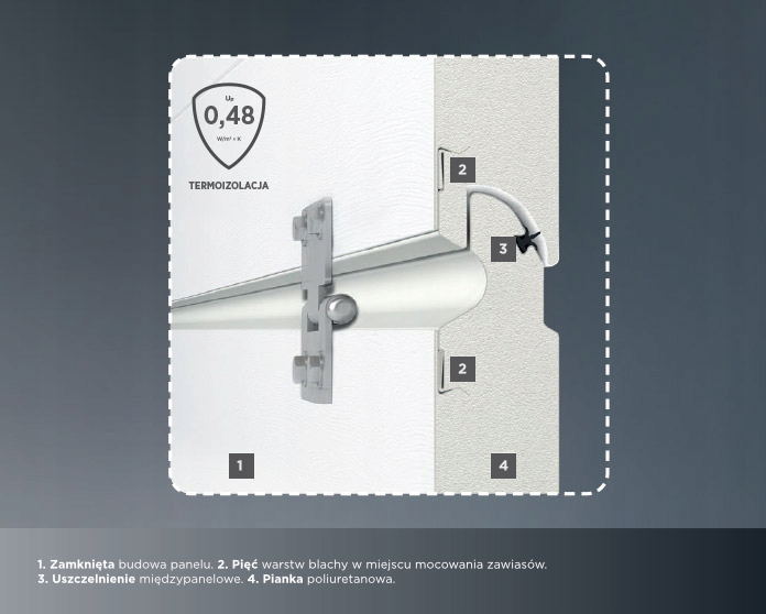 Наші гаражні ворота – це теплі ворота, а U Коефіцієнт, який вони досягають, порівнянний з коефіцієнтом багатокамерних вікон, що використовуються в енергозберігаючому будівництві. Ми можемо досягти такого низького значення завдяки нашому власному виробництву панелей, наповнених пінополіуретаном, і систем ущільнення.