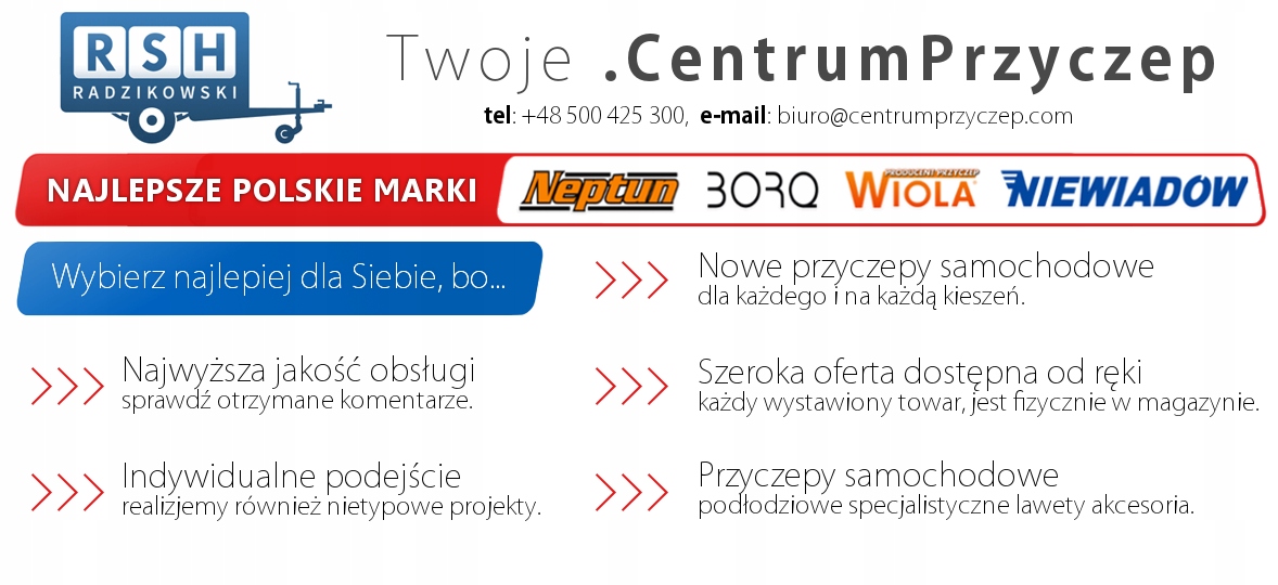 The company RSH Radzikowski Authorized distributor: Neptune, Boro, Wiola, Niewiadów, Farotrailers, Gewe, Al-Ko, Knott ... offers: a new Wiola Silezia trailer comfort plus length 292cm x width 142cm (version with brake) PLN 11 300,00 валовий (ціна каталогу виробника: PLN 12255,00 валовий)