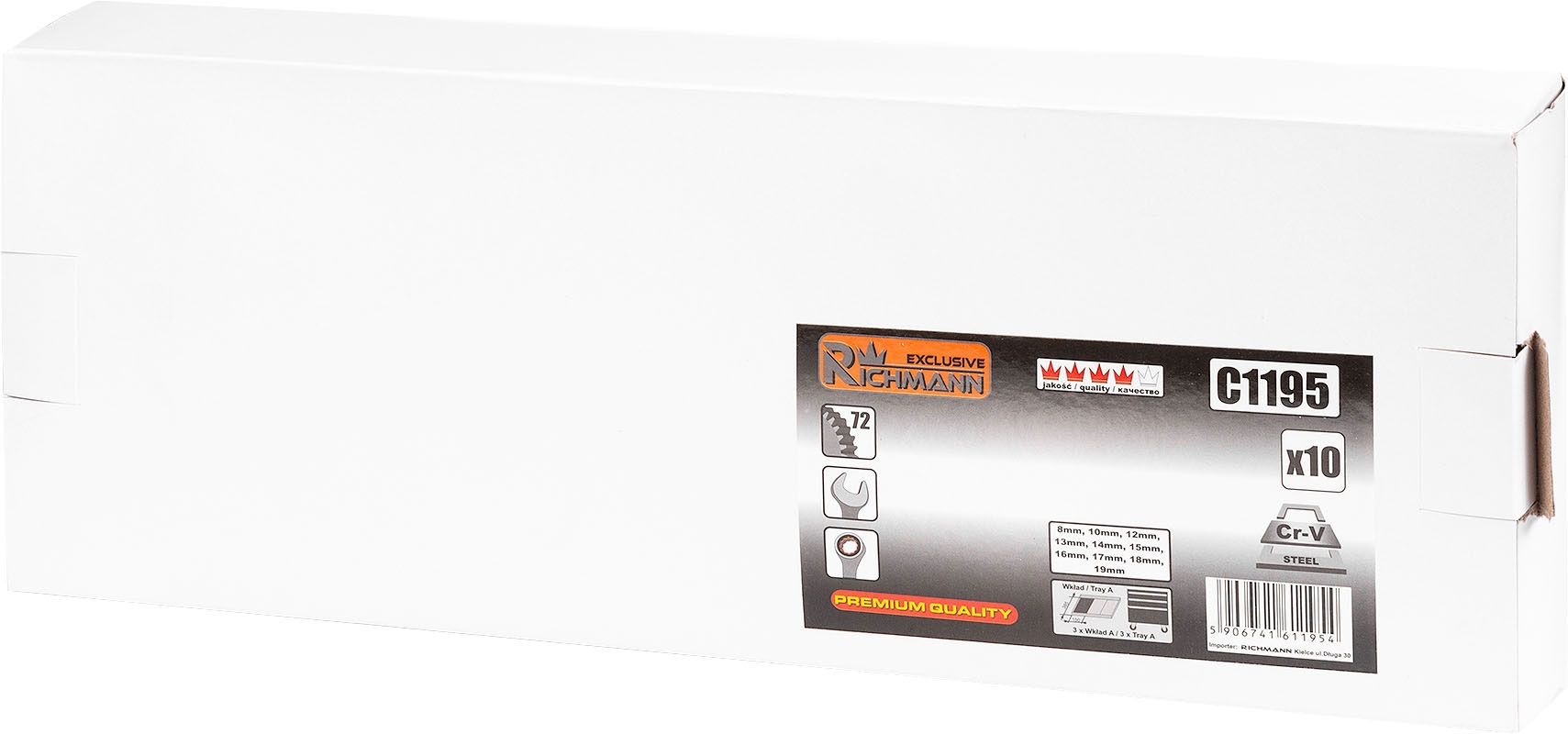 У набір входять розміри [мм]: 8, 10, 12, 13, 14, 15, 16, 17, 18, 19
