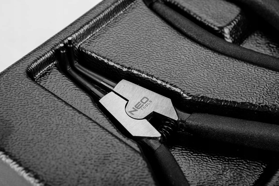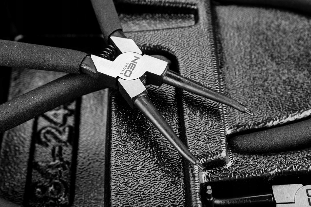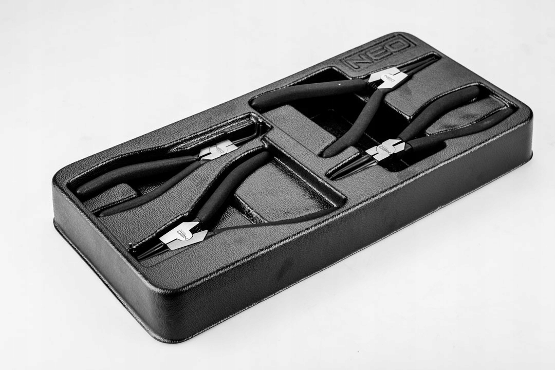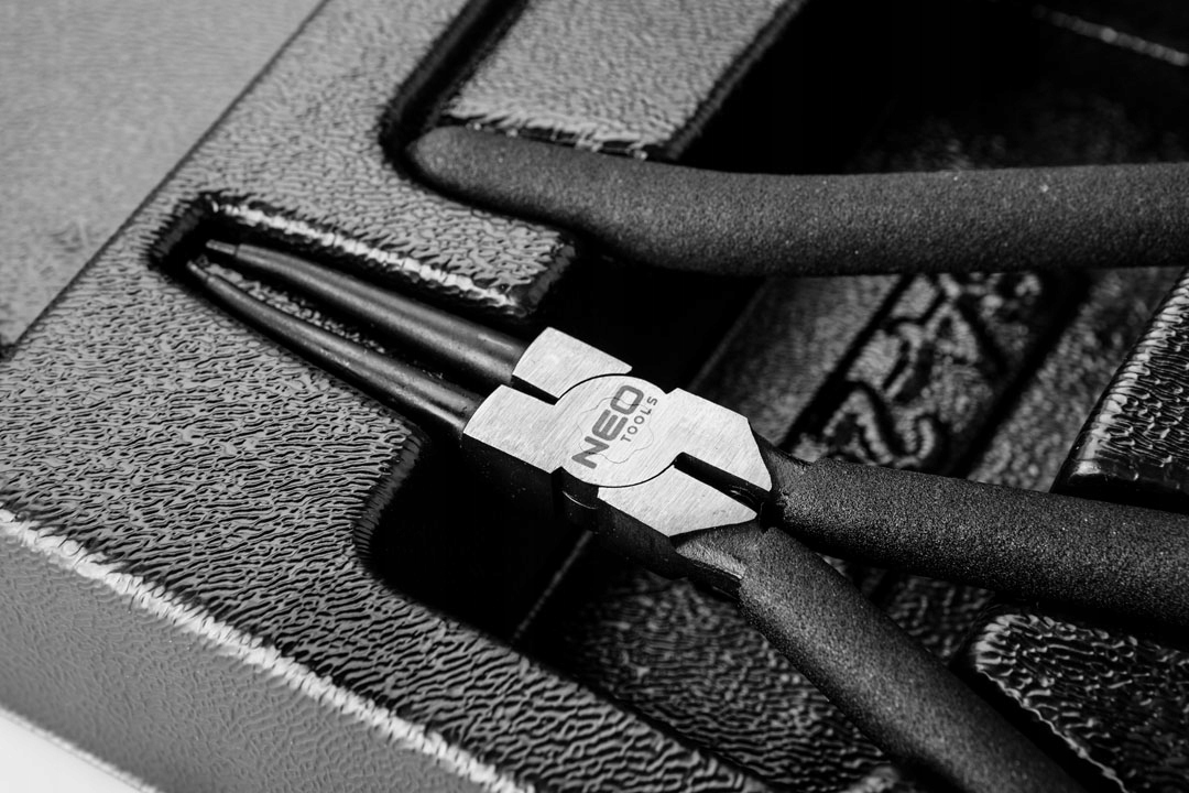 Набір кліщів для стопорних кіл NEO (арт. 84-240) містить 4 кліщі для стопорних кілець 19-60 мм. Плоскогубці прямі зовнішні та внутрішні та гнуті зовнішні та внутрішні плоскогубці довжиною 180 мм. Високоякісна хромованадієва сталь забезпечує довговічність кліщів. Ручки з протиковзким покриттям добре лягають в руку і сприяють міцному захопленню. Поставляється в пластиковому молдингу, який підходить до ящиків робочих шаф NEO 84-221 і 84-222. Надійність продукції підтверджується гарантією 25 років. Торгова марка NEO відповідає очікуванням професіоналів.