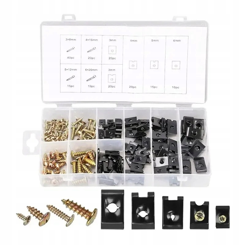 Набір містить 170 штук різних типів гвинтів і листового металуk, які зазвичай використовуються в автосервісах, майстернях і людьми, які люблять доглядати за своїм автомобілем самостійно.