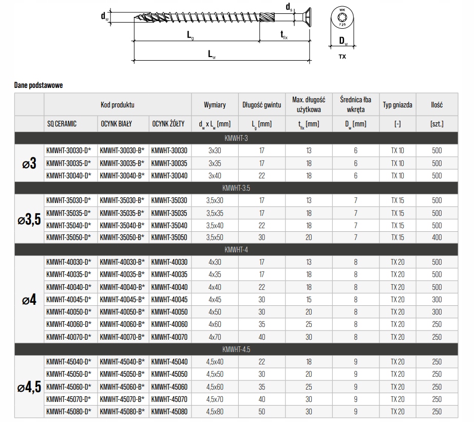 - Гвинти виготовлено відповідно до стандарту PN-EN 14592-2008 Цей європейський стандарт визначає вимоги та методи випробування матеріалів, геометрії, міцності, жорсткості та довговічності (тобто захисту від корозії) з’єднувачів, які використовуються в несучих дерев’яних конструкціях
