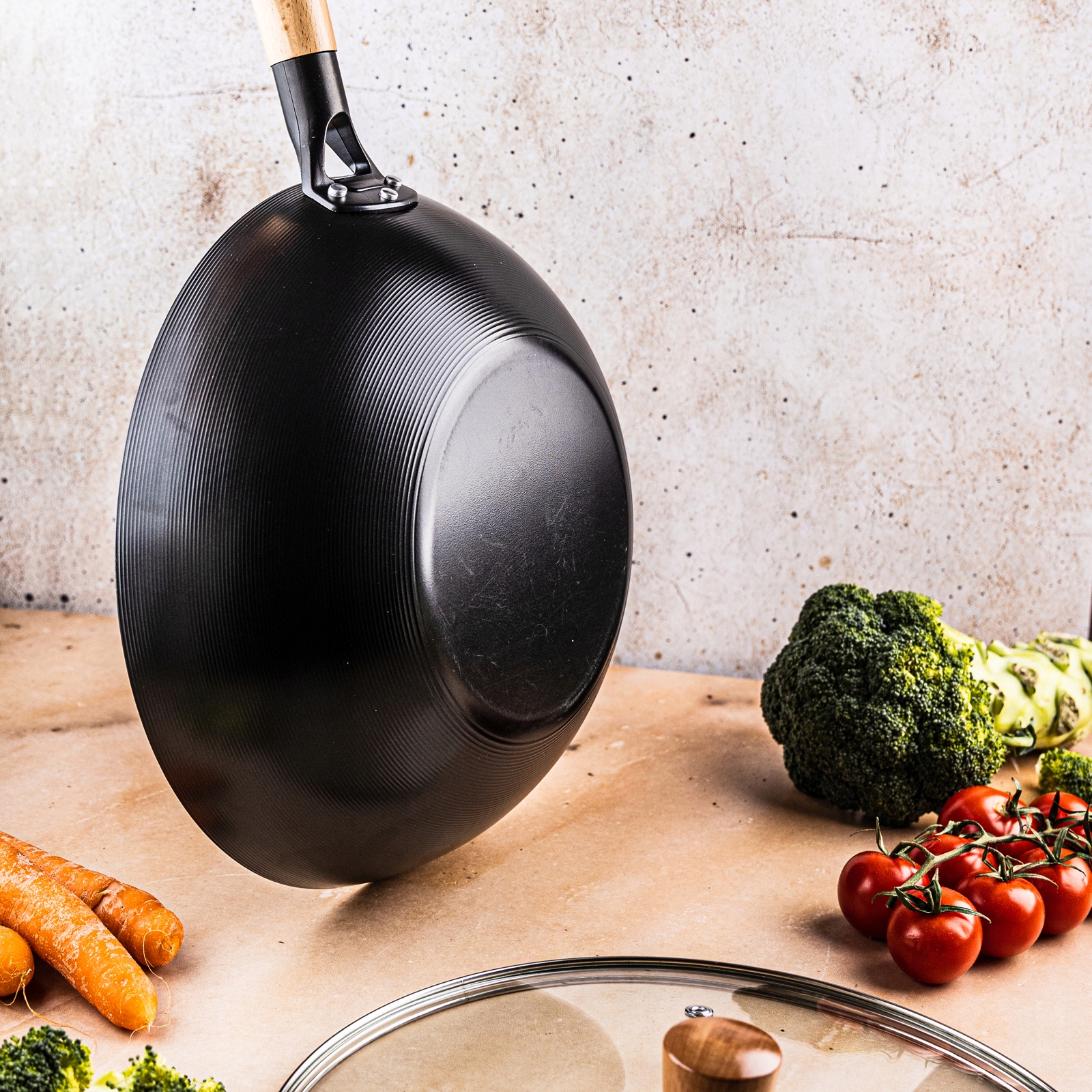 ✅ Завдяки скляній кришці з паровим клапаном, яка входить у комплект, вок є надзвичайно універсальним: ідеально підходить для швидкого смаження, тушкування або приготування азіатських страв.