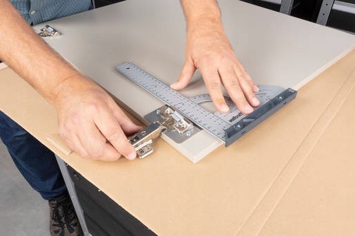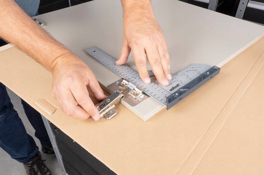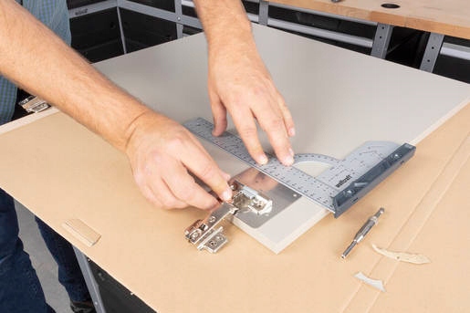 - Вставте самоцентруюче свердло для петлі в отвори для гвинтів петлі та просвердліть фасад меблів.
