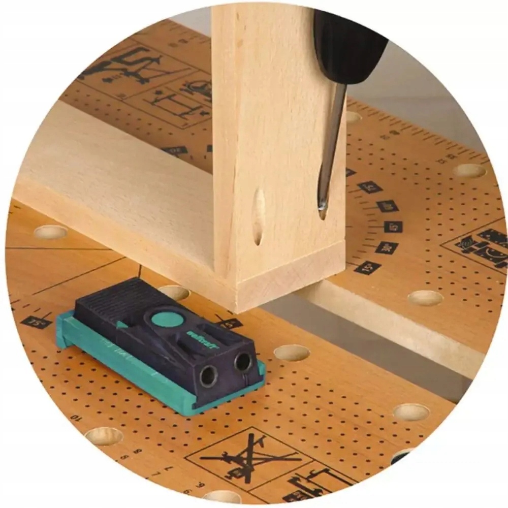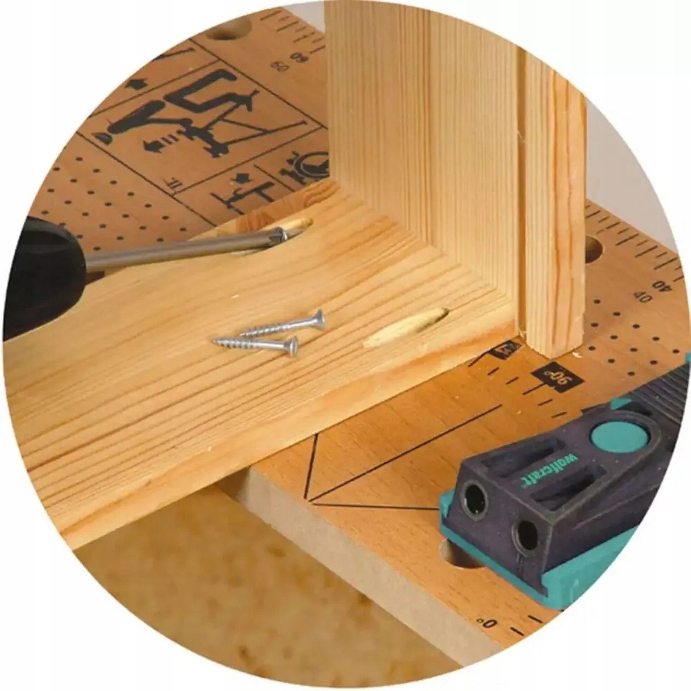 Джиг під прикриттям, встановлений Wolfcraft, - це просторий, повний пакет, що містить усе, необхідне для буріння та здійснення прихованих з'єднань для гвинтів у дереві. Здійснення точного та стабільного зв’язку без великої роботи лише за 3 кроки. Основним елементом цього набору є під прикриттям джиг - шаблон для свердління кишенькових отворів. Комплект також включає спеціальну свердло, межу глибини свердління, ключ Аллена, гвинти з відповідним наконечником викрутки та дерев’яними пробками. Набір джигів під прикриттям дозволяє зробити точні, косі отвори, в які гвинти потім накручують, щоб отримати точне і стабільне з'єднання дерев’яних елементів. Товщину дошки можна виміряти безпосередньо на шаблоні до отворів. Шаблон має практичну шкалу з найпопулярнішими дошками, позначеними - від 12 мм. Поступове свердло також входить у набір: наконечник свердла використовується для просвердлення невеликого отвору, що веде до гвинтової нитки, тоді як 2 -й ступінь свердла знову зібрала отвір для гвинтової головки. Після виготовлення отворів дерев'яні елементи можуть бути стабільними з гвинтами. Найбільша перевага порівняно зі звичайним гвинтовим з'єднанням - це гвинти, невидимі ззовні. Прикріплені дерев’яні кінцеві ковпачки для маски. Це найточніше і просто, ніж як з'єднати елементи. Набір джигів під прикриттям ідеально підходить для будівництва меблів та ремонту ящиків, полиць та шаф.