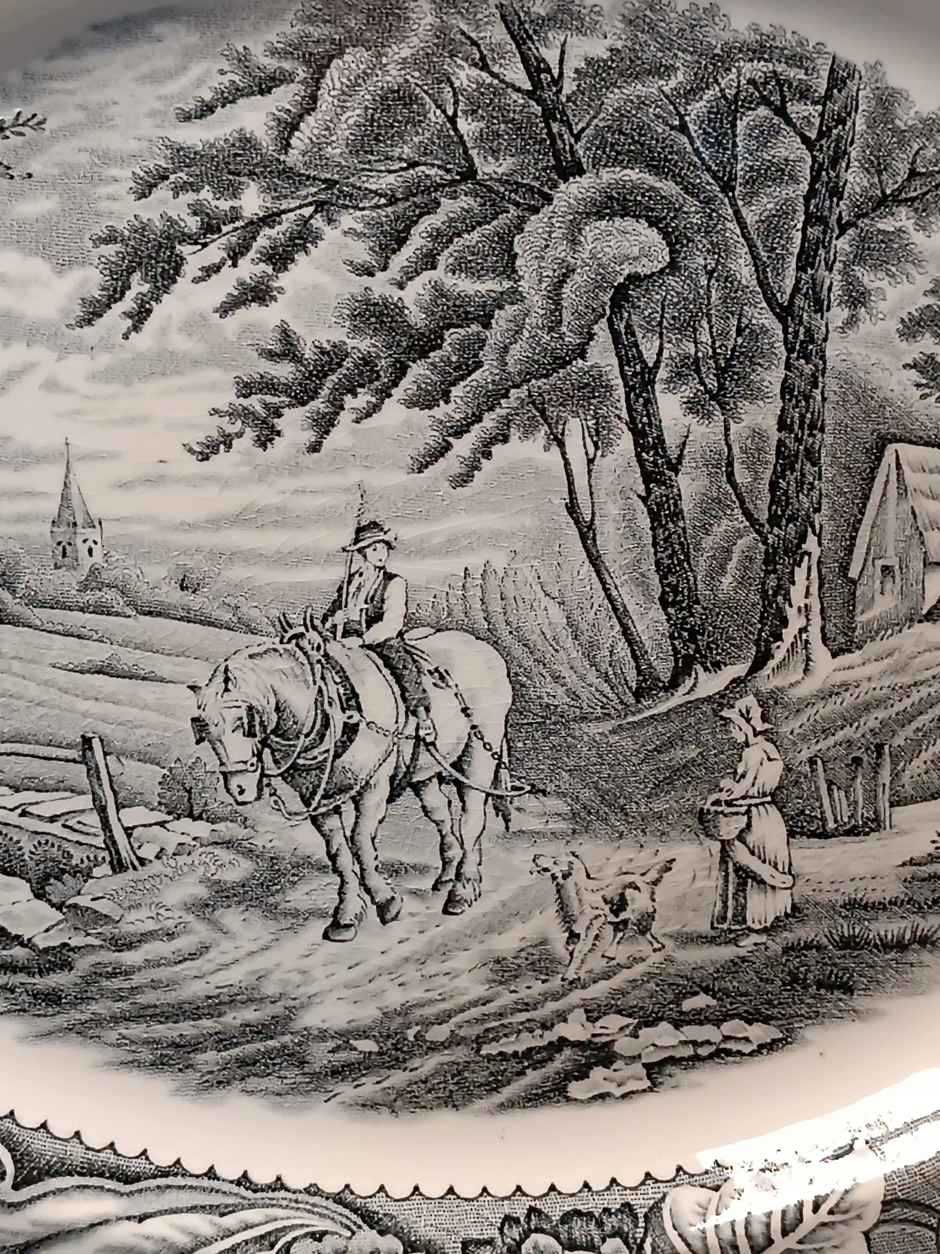 Це овальне блюдо — це посуд у стилі Transferware під назвою «Woodland», виготовлений Wood & Sons of Burslem, Англія.