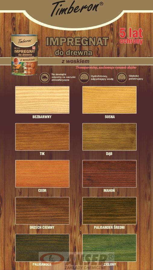 Просочення TIMBERON проникає глибоко в деревини та після висихання не створює прозорого покриття, як типові лаки чи фарби. Після просочення і висихання деревина має матову поверхню. Безбарвні та кольорові просочення можна змішувати для отримання різного кольору, але спочатку слід провести тест на невеликій кількості.
