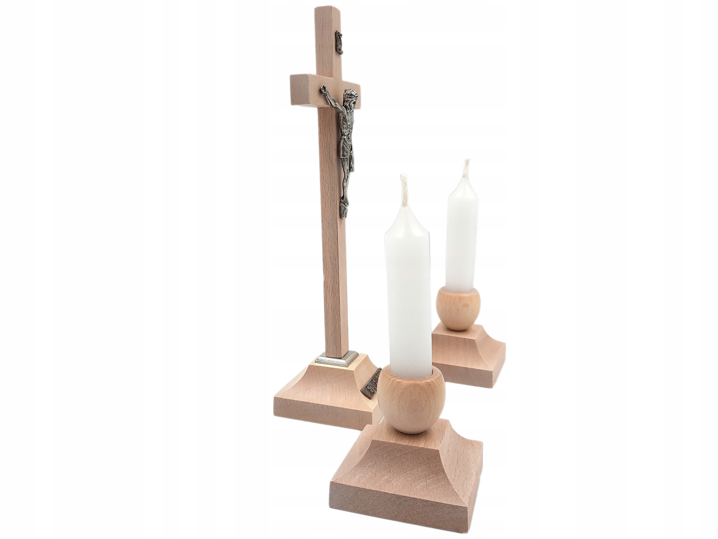 Набір складається зі стоячого дерев'яного хреста висотою 22 см та двох підсвічників для настільних свічок.
