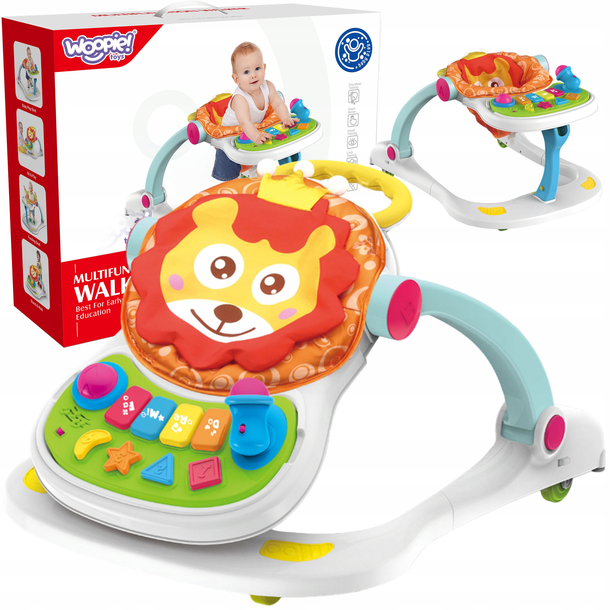 Багатофункціональні ходунки від WOOPIE призначені для дітей віком від 6 місяців. Він має барвистий інтерактивний ігровий лоток, оснащений кнопками, підсвічуванням та іграшками, які стимулюють почуття дитини та сприяють розвитку її/її моторики. Ходунки забезпечують підтримку малюкам, які вчаться робити свої перші кроки, і в той же час пропонують цікаві заняття, які заохочують до навчання та відкриття.