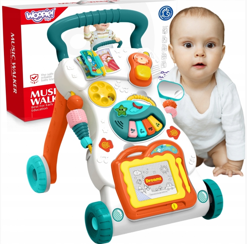 , граючи в ходунку від бренду woopie - музична іграшка для немовлят. Він призначений для дітей віком 6+ місяців . Іграшка має інтерактивні елементи, , які можуть допомогти розвинути рухові навички, координацію очей та сенс слуху завдяки вашим музичним функціям. Іграшка оснащена барвистими кнопками та ручками , які не тільки стимулюють око , але й відтворюють різні мелодії при натисканні або обертанні. Ця цікава іграшка пропонує як підтримку для ходьби малюків , так і розваг, що підтримує їх інтерес, що робить її багатофункціональним інструментом для ранніх етапів розвитку.