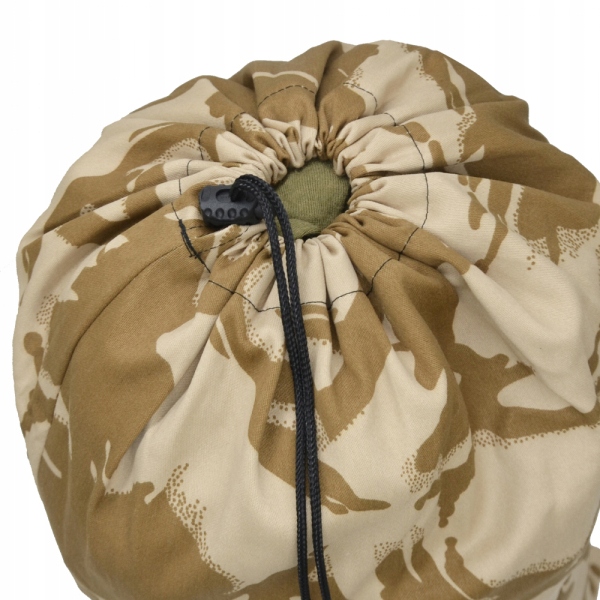 Транспортна сумка, виготовлена з матеріалу, який використовується для виробництва чохлів для рюкзака "Cover Rucksack Large". Зверху має шнурок зі стопором, завдяки якому ми можемо затягнути верх сумки, щоб не втратити вміст. Виготовлений з бавовни з домішкою поліестеру в пустельному камуфляжі Desert DPM.