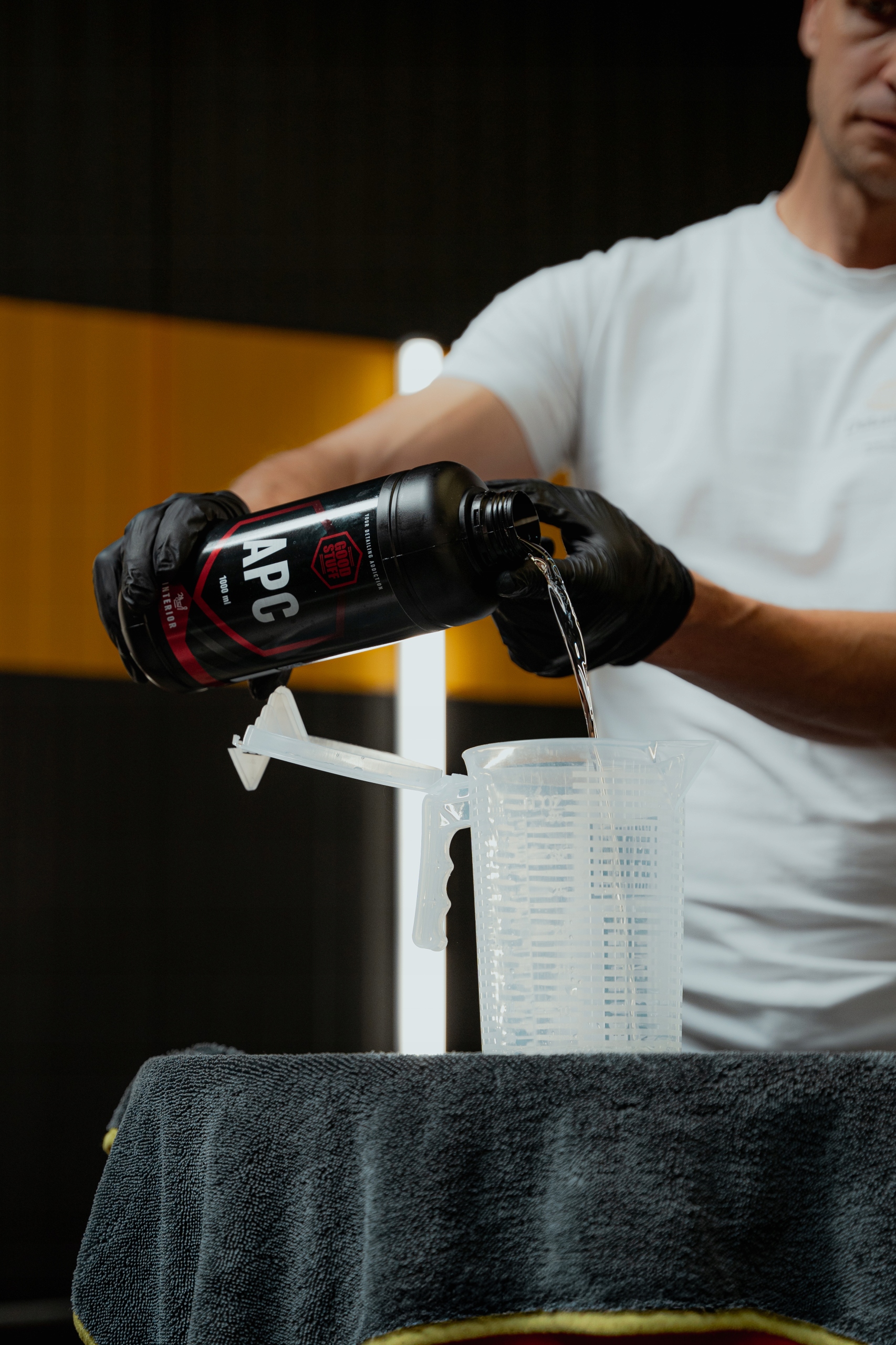 Мірна чашка Work Stuff є важливим інструментом для точного вимірювання хімічних розчинів під час миття автомобіля. Виготовлений із хімічно стійкого поліпропілену, він ідеально підходить як для ентузіастів, так і для професіоналів з догляду за транспортними засобами.
