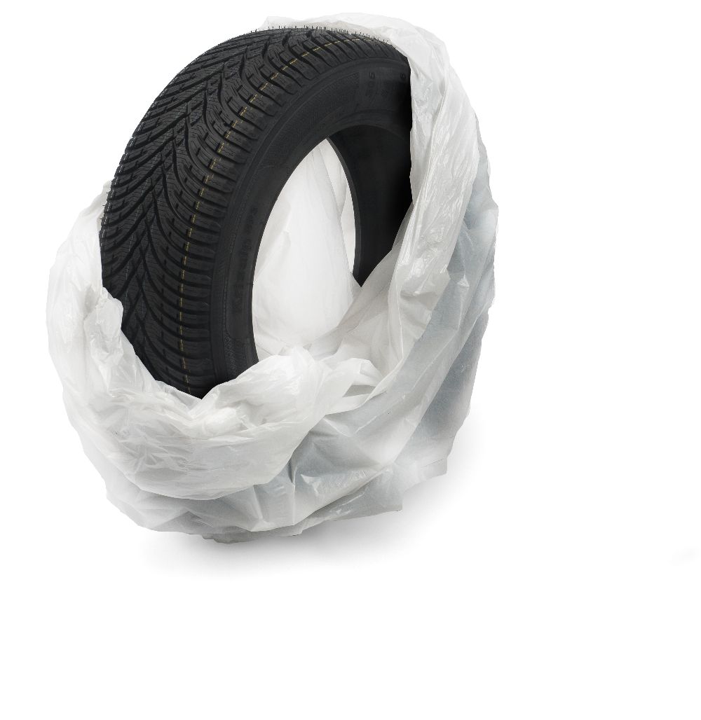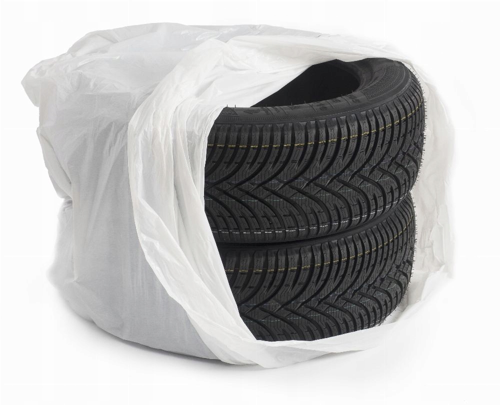 Білі мішки з фольги розміром 1100 х 1000 мм захищають шини від погодних умов під час зберігання, а завдяки їх розміру в один мішок можна помістити до 2 шин