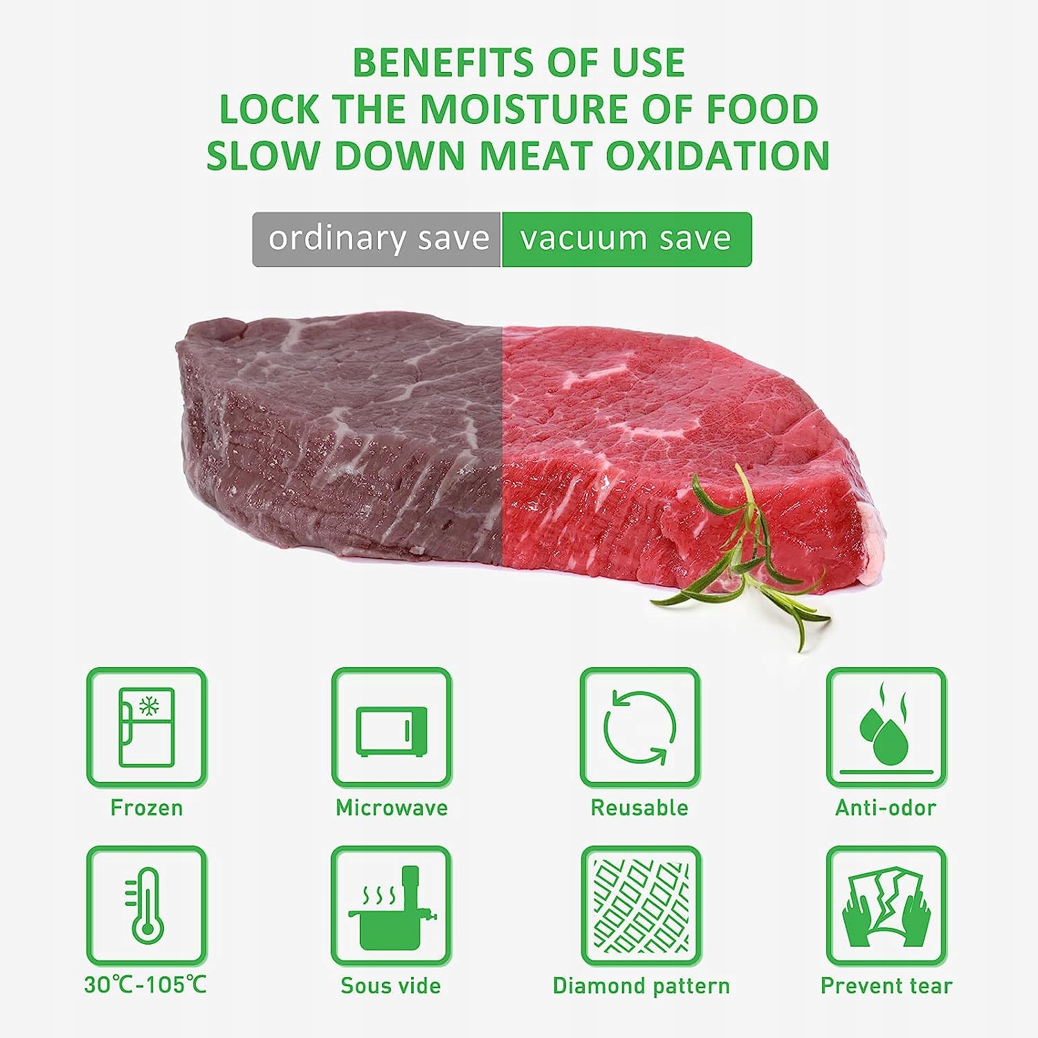 Матеріал: PA смола (поліамід) + PE смола (поліетилен). Можна використовувати для різних харчових продуктів, від заморожених продуктів до вологих харчових продуктів. Не лише для домашнього, але й для комерційного використання, оскільки він дуже міцний.