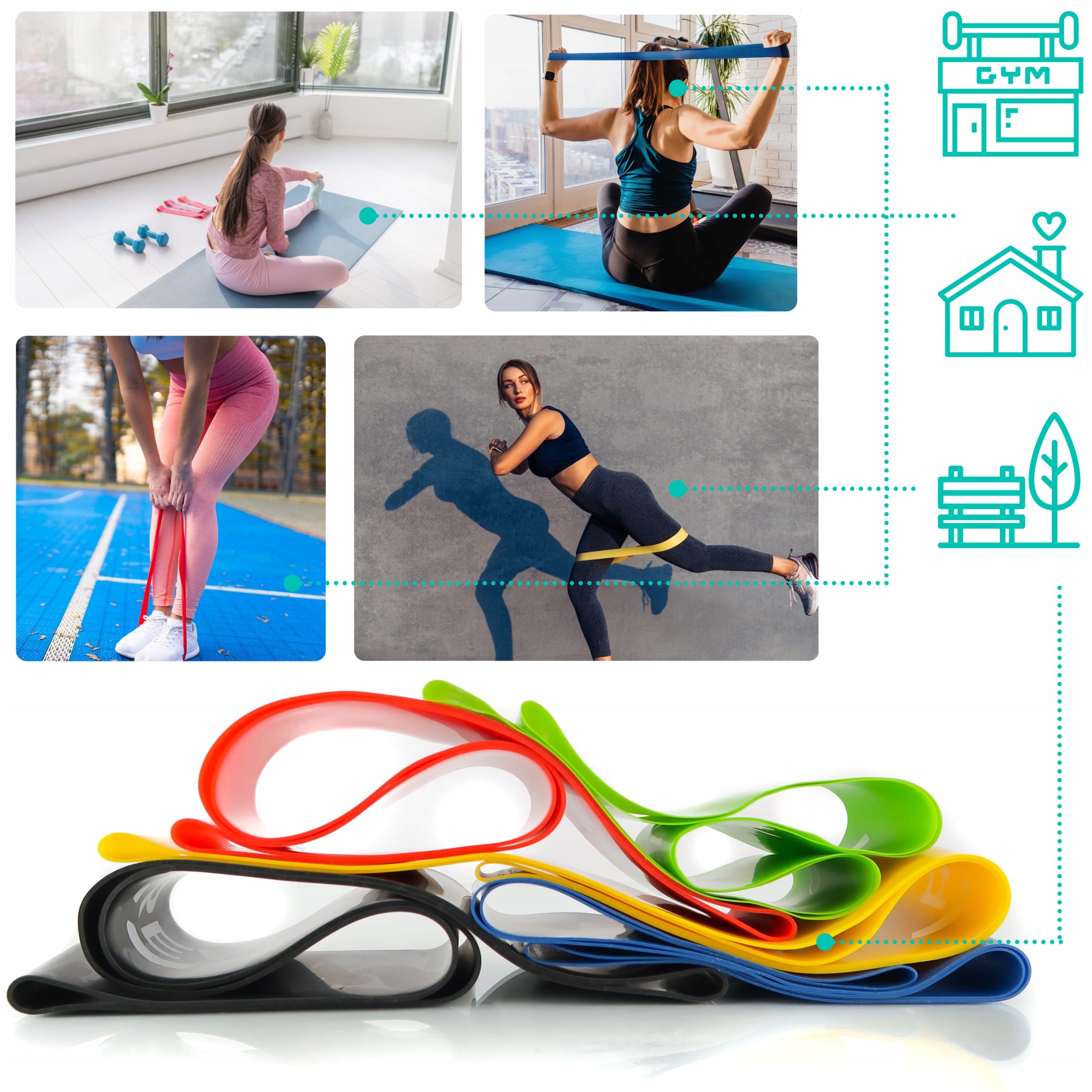 ✅ При покупці ви отримуєте унікальний набір з 12 елементів (включаючи 5 резинок, які зручно комбінувати в будь-якій конфігурації для отримання витривалості від 10 до 100 кг з додатковим кільцем, що покращує опірність на кінці кожної гумки.