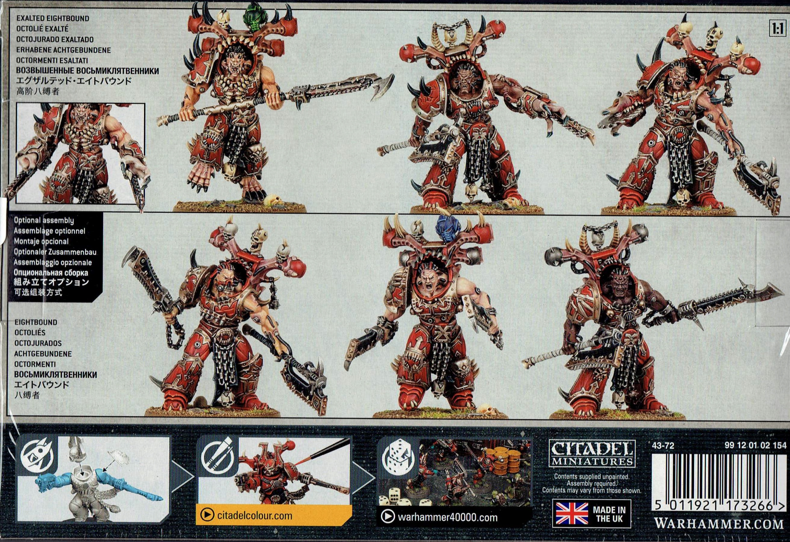 Цей багатокомпонентний пластиковий набір складається з трьох Eightbound – неймовірно потужних напівдемонів, створених Пожирачами Світів. Ці жахливі воїни нагадують викривлених, зарослих Кхорн-Берзеркерів, від їх відкритих м’язів і кібернетики до їх вишуканих і покручених обладунків. Кожен Eightbound озброєний двома потрошителями, масивною ланцюговою зброєю, що нагадує ланцюгові мечі або ланцюгові сокири. Ви також можете побудувати Чемпіона з вісімкою, який замість цього може бути озброєний парою тесаків, схожих на тесак, або дворучною важкою ланцюгою.