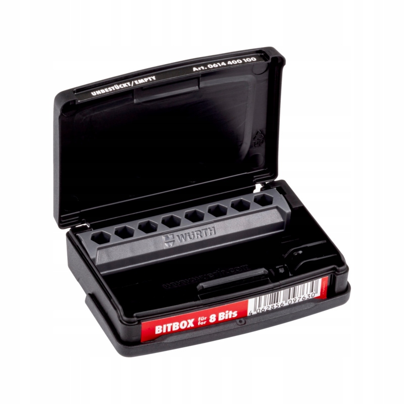 Порожня коробка Würth для біт ORSY 1/4 дюйма – це високоякісна коробка, призначена для професіоналів, які використовують систему ORSY®. Ідеально підходить для зберігання до 8 біт і тримача. Завдяки міцній пластиковій конструкції та інноваційним рішенням він забезпечує комфорт і безпеку використання.