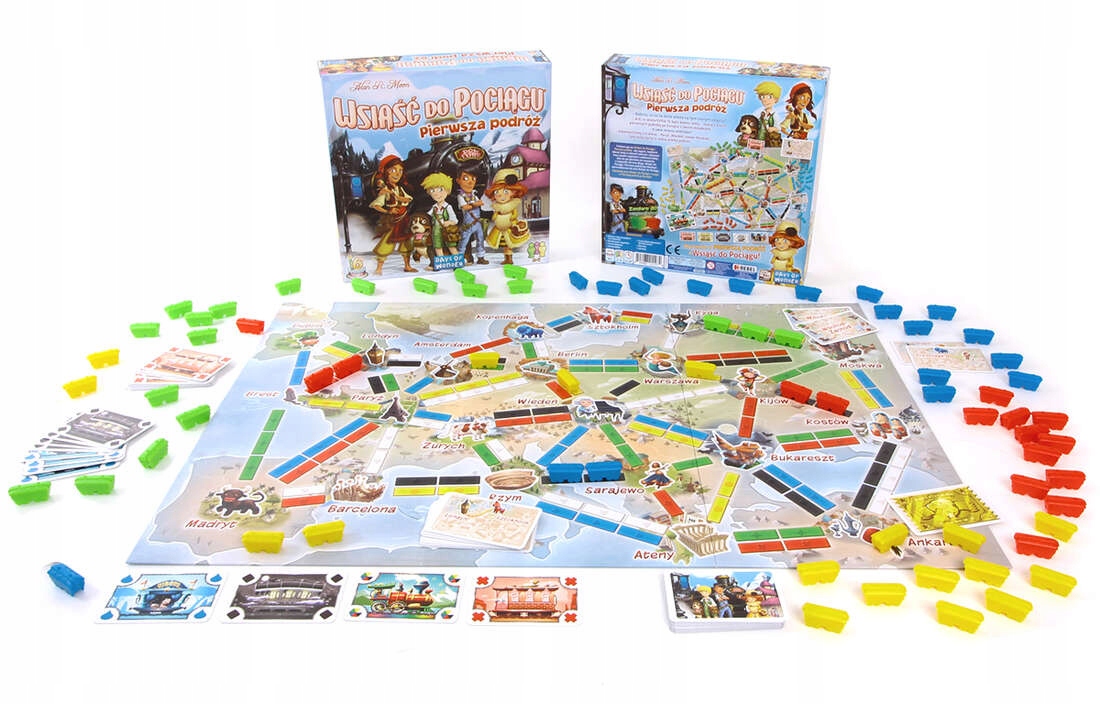 «Сідай на потяг: Перша подорож» — гра для дітей, яка є чудовим вступом до «дорослої» серії ігор «Сідай на потяг». У грі є карта Європи зі скороченими маршрутами та характерними для кожного міста ілюстраціями. Завдяки цій простішій версії початківці та наймолодші гравці можуть зробити свої перші кроки, подорожуючи та відвідуючи міста нашого континенту. Незважаючи на те, що правила дещо змінено, а цілі у вигляді карток квитків легше виконувати, гра залишається вірною до механіки, характерної для всієї серії, - гравці змагаються, щоб зайняти маршрути на дошці. Пам'ятні малюнки, відображені на квиткових картках, полегшують пошук міст на табло найменшим діткам, які з радістю їдуть наступними маршрутами, користуючись більшими за звичайні пластиковими вагонами.Все наше життя - одна велика подорож! Гарної подорожі Європою! ЗМІСТ: ігрове поле, 80 пластикових вагонів, 72 картки потягів, 32 картки квитків, 4 картки спеціальних квитків, золотий квиток, інструкції.