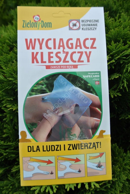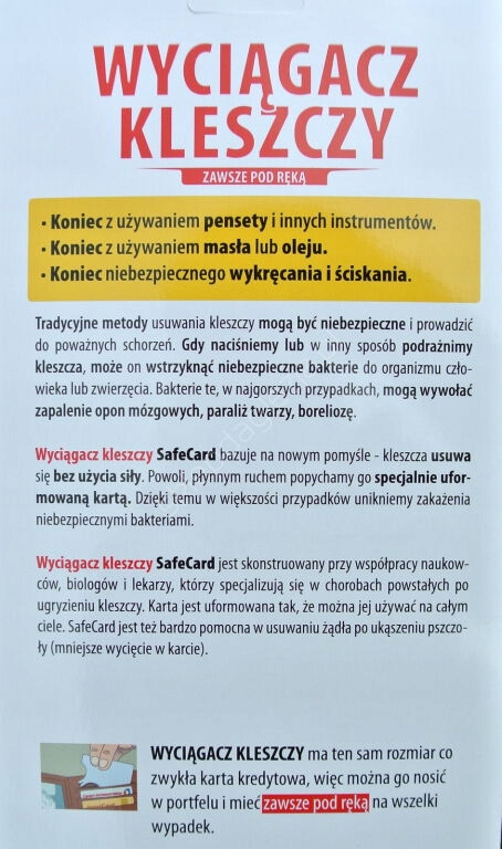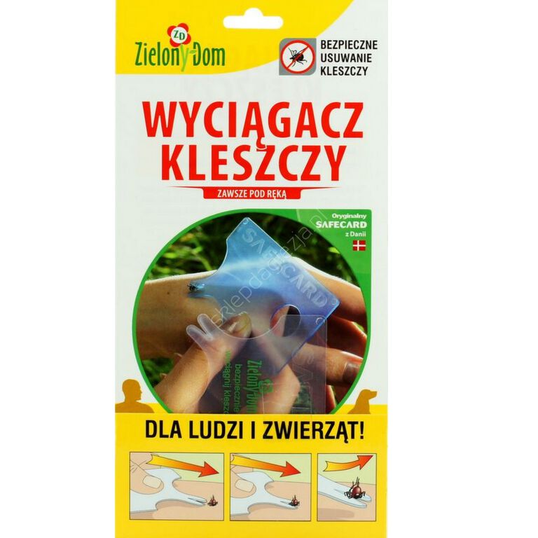 Традиційні методи видалення кліща можуть бути небезпечними та призвести до серйозних захворювань. Коли ми натискаємо або іншим чином дратуємо кліща, він може ввести небезпечні бактерії в організм людини чи тварини. Ці бактерії, в найгіршому випадку, можуть викликати менінгіт, лицьовий параліч і хворобу Лайма. В основі екстрактора SafeCard лежить нова ідея - галочка видаляється без застосування сили. Повільно, плавним рухом проштовхуємо його спеціально сформованою карткою. Завдяки цьому в більшості випадків ми уникнемо зараження небезпечними бактеріями. Пристрій для видалення кліщів SafeCard розроблено у співпраці з вченими, біологами та лікарями, які спеціалізуються на захворюваннях, викликаних укусами кліщів. Картка має таку форму, що її можна використовувати на всьому тілі. SafeCard також дуже допомагає при видаленні жала бджоли (менший виріз у картці). Пристрій для видалення кліщів має такий самий розмір, як і звичайна кредитна картка, тому ви можете носити його в гаманці та завжди мати під рукою про всяк випадок.