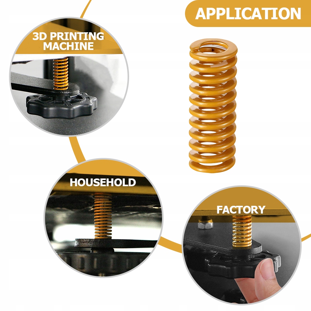 ✅ Залежно від типу навантаження жовта пружина є найлегшою навантаження та є жорсткішою за звичайну пружину, що може допомогти вашому 3D-принтеру друкувати стабільніше та міцніше, а також краще підтримувати рівень друкарської подушки.