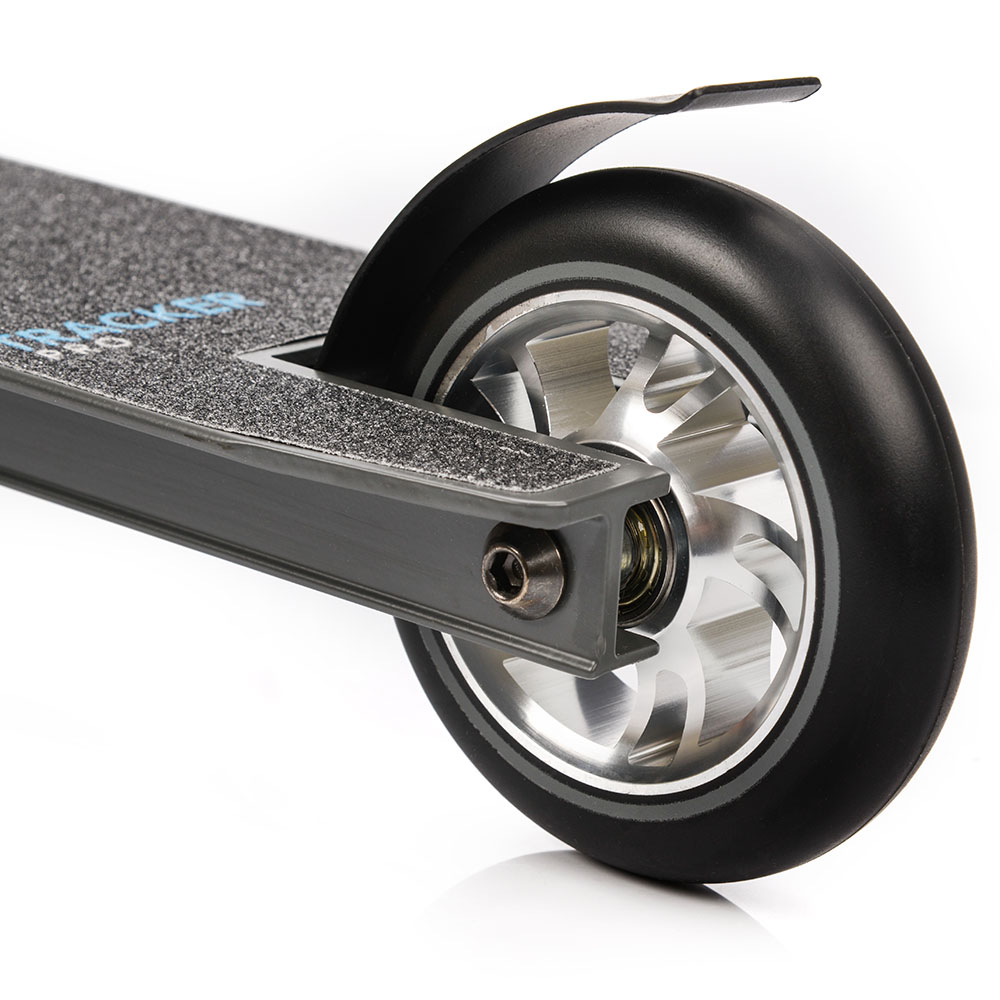 Meteor stunt Tracker — це трюковий самокат, розроблений для досвідчених користувачів, виготовлений із алюмінію найвищої якості. Це професійний скутер з дуже міцною та довговічною конструкцією, яка дозволяє агресивно та екстремально кататися, стрибати та всілякі трюки на рампах. Особливе з'єднання керма з підсідельним штирем і відсутність складних частин забезпечують максимальну довговічність. Високоякісні підшипники ABEC-7 і великі поліуретанові колеса на алюмінієвому ободі відповідної твердості забезпечують швидку і тиху їзду. Над заднім колесом є ножне гальмо. Всі з'єднувальні та кріпильні гвинти виготовлені зі сталі, що гарантує довговічність з'єднань. Кермо оснащено гумовими ручками для надійного захоплення. Упаковано в коробку, ідеально підходить для подарунка.