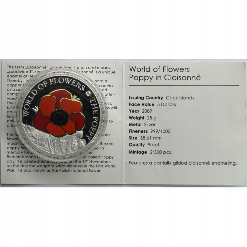 Wyspy Cooka, 5 dolarów 2009, Kwiaty świata - mak, srebro Ag999