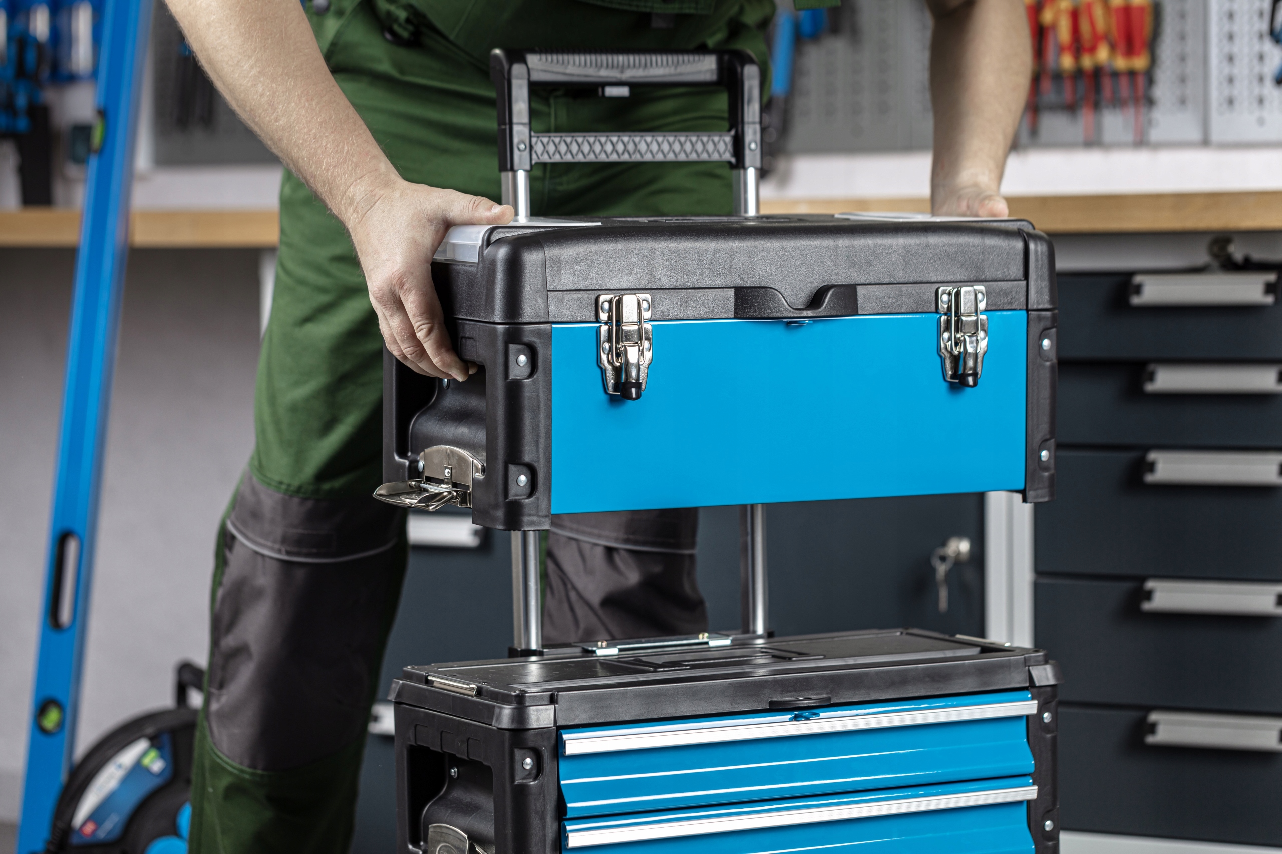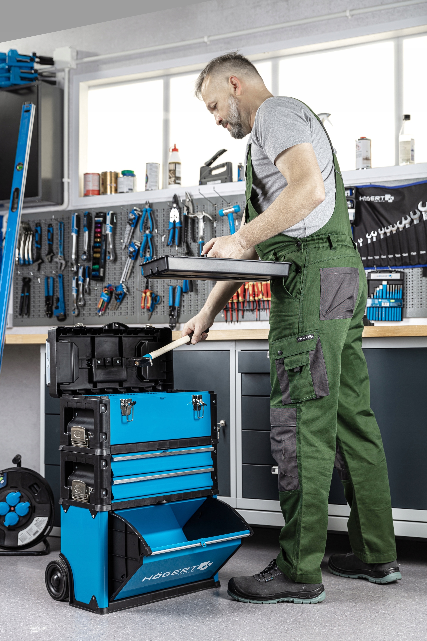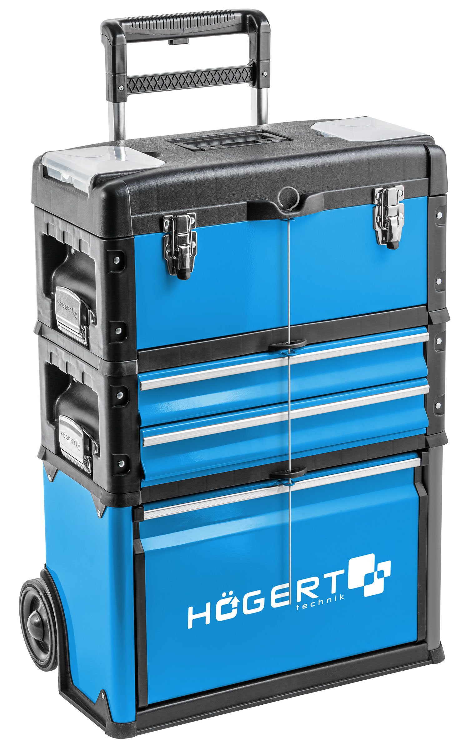 3-компонентна, модульна, мобільна шафа для обслуговування. Три незалежних модуля з ящиком, висувними ящиками і містким відділенням для зберігання дозволяють організовано зберігати до 45 кг інструментів. Однак його компактні розміри, встановлені колеса і телескопічна складна ручка дозволяють транспортувати його на автомобілі і доставляти практично до робочої станції. Завдяки цьому він відмінно підійде як для компаній, що надають послуги сервісу, автомайстерень, так і в гаражі кожного любителя DIY. Ідеальне рішення для професіоналів, які цінують мобільність, безпеку та гнучкість.
