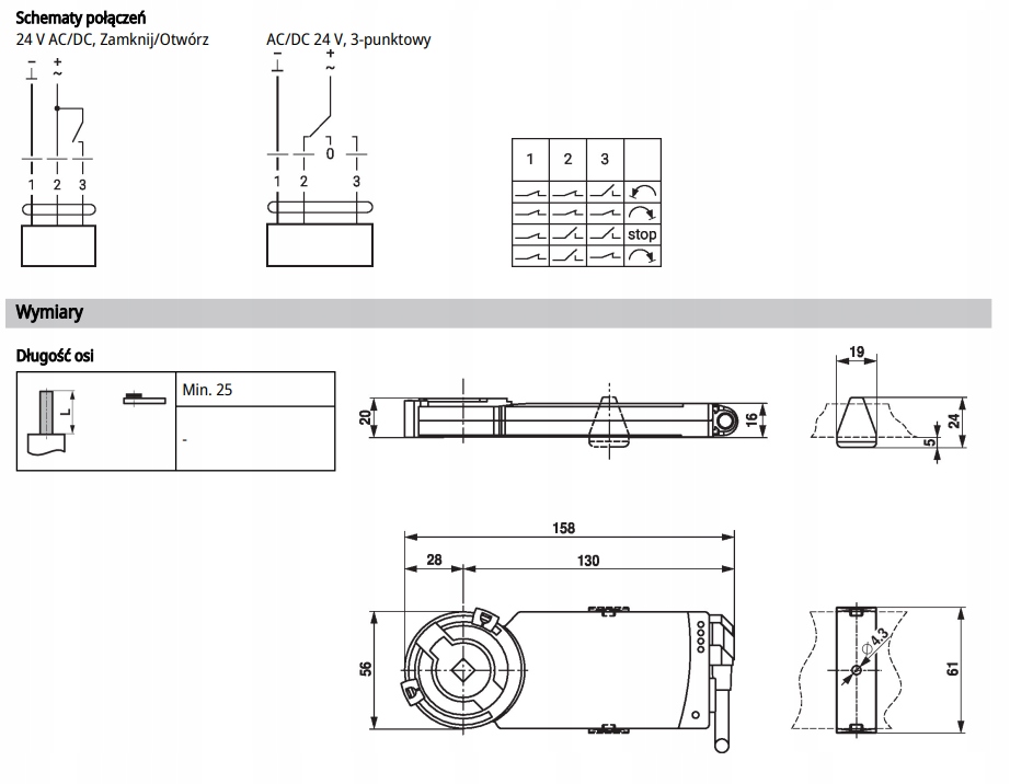 - AC/DC 24 В , 3-б. - 3 дроти (нейтраль, фаза для відкриття та фаза для закриття - ви можете постійно підключити нейтраль та одну фазу, тоді як третя фаза керуватиме заслінкою ліворуч/праворуч)