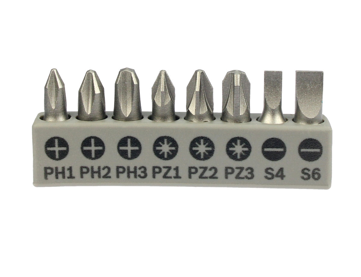 Компактне розташування свердел, насадок для викрутки та інструментів забезпечує порядок і допомагає заощадити місце під час зберігання приладдя.
