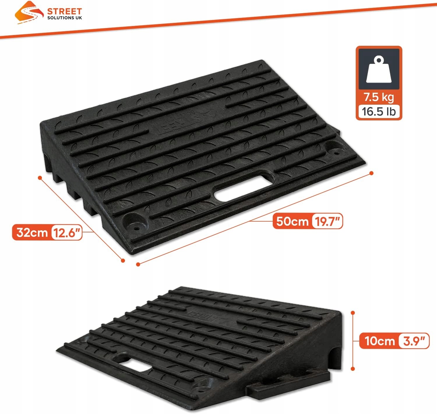 - Довговічний – створений, щоб довговічно! Бордюри Street Solutions виготовляються з ПВХ найвищої якості та легко витримують навантаження 20 000 фунтів. Приголомшливий результат, оскільки кожен переносний гумовий пандус важить 7,5 кг