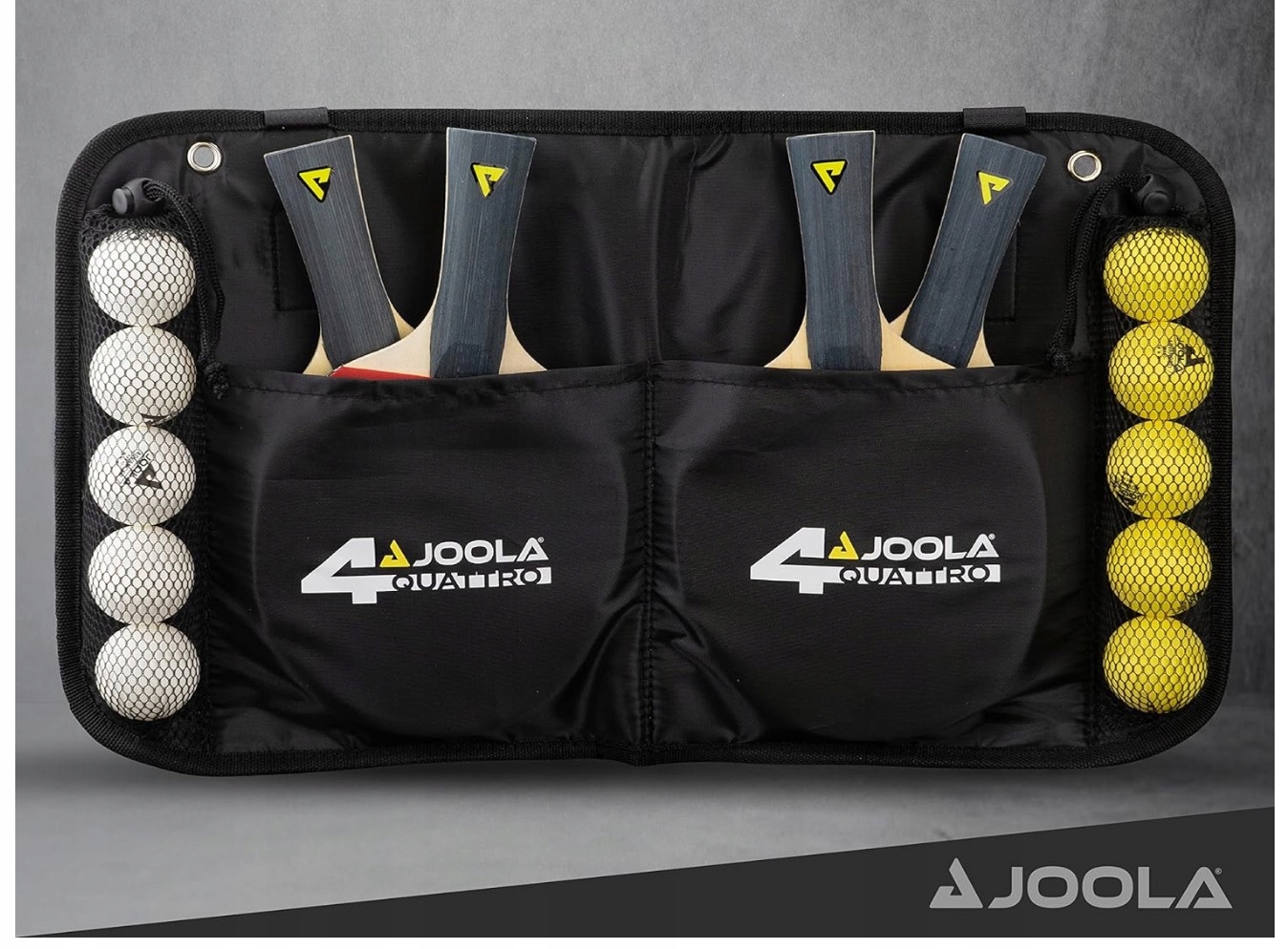 Набір JOOLA Set Quattro поставляється в зручній сумці, яку можна прикріпити до столу, і вміщує всі ваші аксесуари для настільного тенісу!