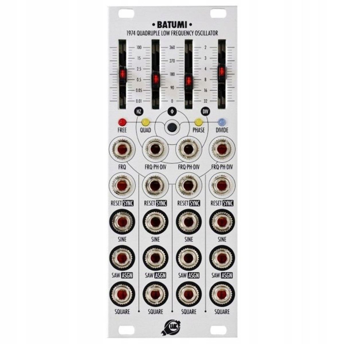 XAOC Batumi — це чотирикутний LFO-модуль з керованою напругою, який має цікаві функції. Кожен з генераторів модуля може використовуватися окремо або в синхронізованих режимах: квадратурному, фазовому і розділювальному. Кожен осцилятор забезпечує форму хвилі: синусоїдну, квадратну та (пилку, рампу, трикутник і трапецію - вибирається за допомогою перемички на платі). Параметри, що контролюються напругою, включають: частоту генератора, рест і синхронізацію (темп). Доступний діапазон частот від 28 годин! (для розділеного режиму) до 500 Гц.