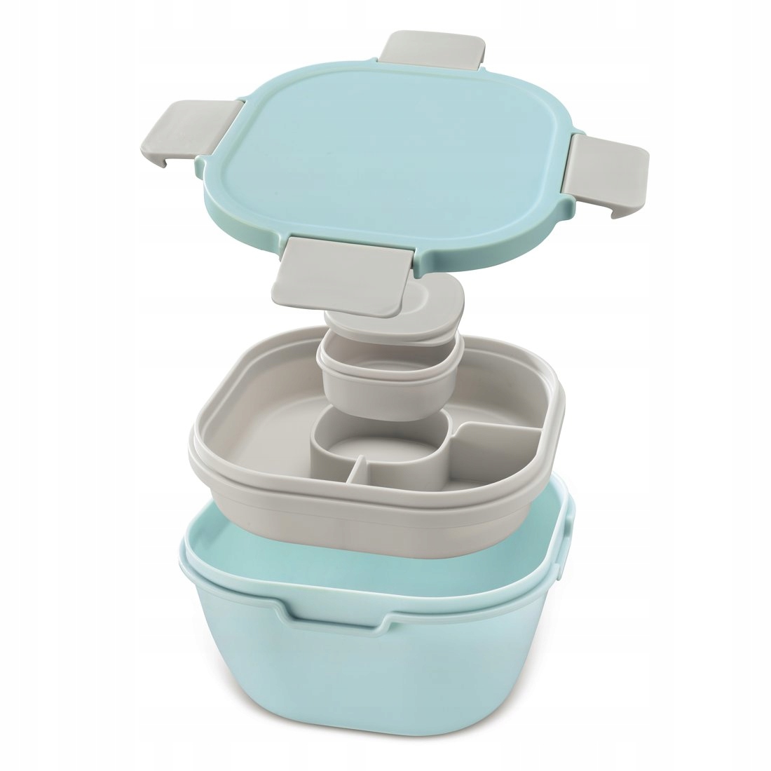 Це контейнер, в основному призначений для зберігання салату. Він складається з трьох рівнів - місткої чаші для листової зелені, контейнера для добавок і окремого місця. для соусу або заправки (80 мл). Це дозволяє змішувати на місці, а всі необхідні інгредієнти не розмокають і виглядають апетитно. Якщо хочете, також додайте насіння, грінки або горіхи, якщо хочете.