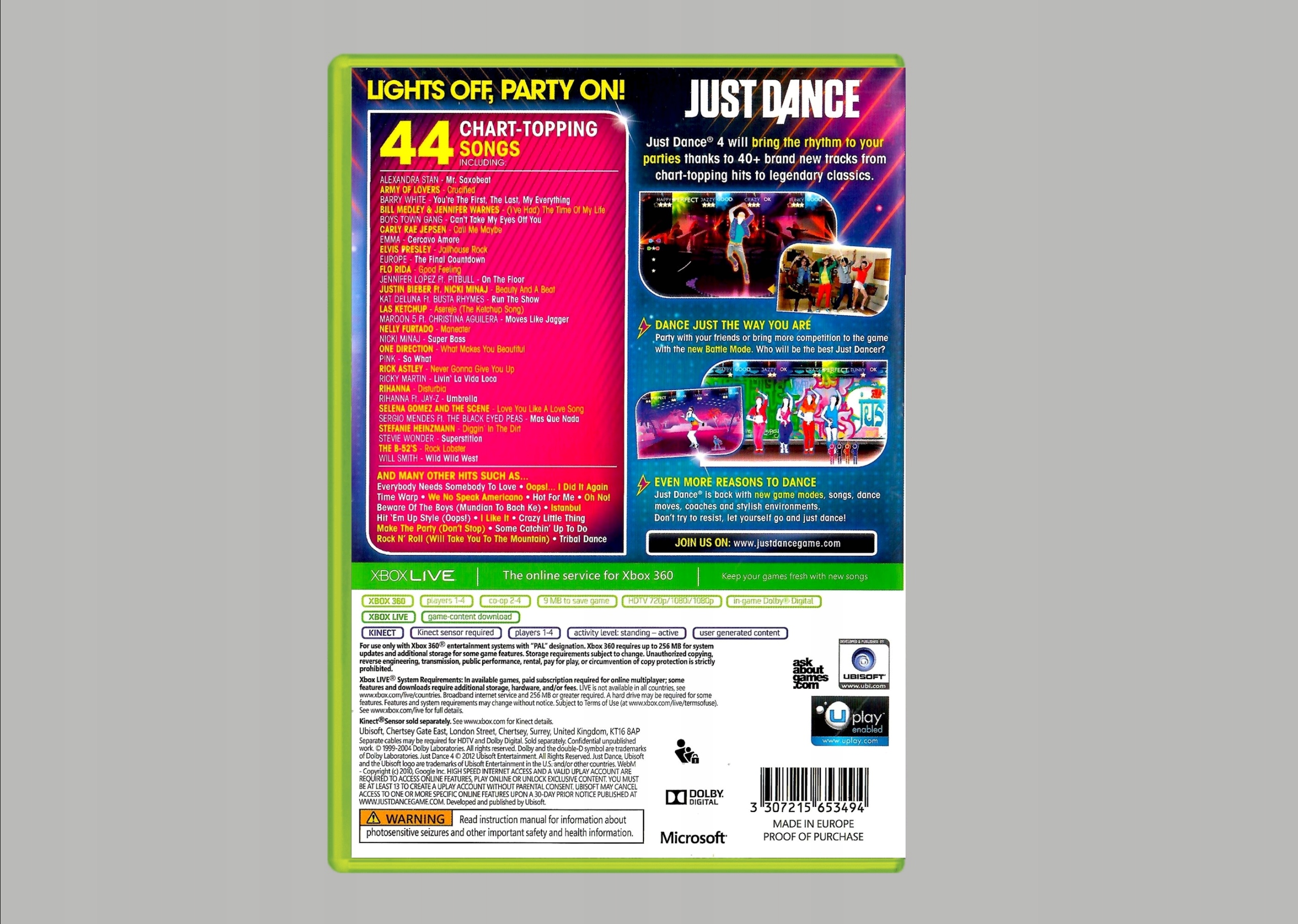 Just Dance 4 — це неймовірно захоплююча танцювальна гра, завдяки якій ви відчуєте себе справжньою зіркою на танцполі. Завдяки інноваційній технології Kinect ви можете танцювати без використання контролера, що робить танці ще більш реалістичними та захоплюючими. Виберіть свої улюблені пісні з різних музичних жанрів і виконуйте ідеальні рухи, рухаючись ритмічно під музику. Насолоджуйтесь неймовірною точністю та влучністю, а також можливістю змагатися з друзями в багатокористувацькому режимі. Це ідеальна гра для всіх любителів танців і музики, які хочуть одночасно розважитися та вдосконалити свої танцювальні навички.
